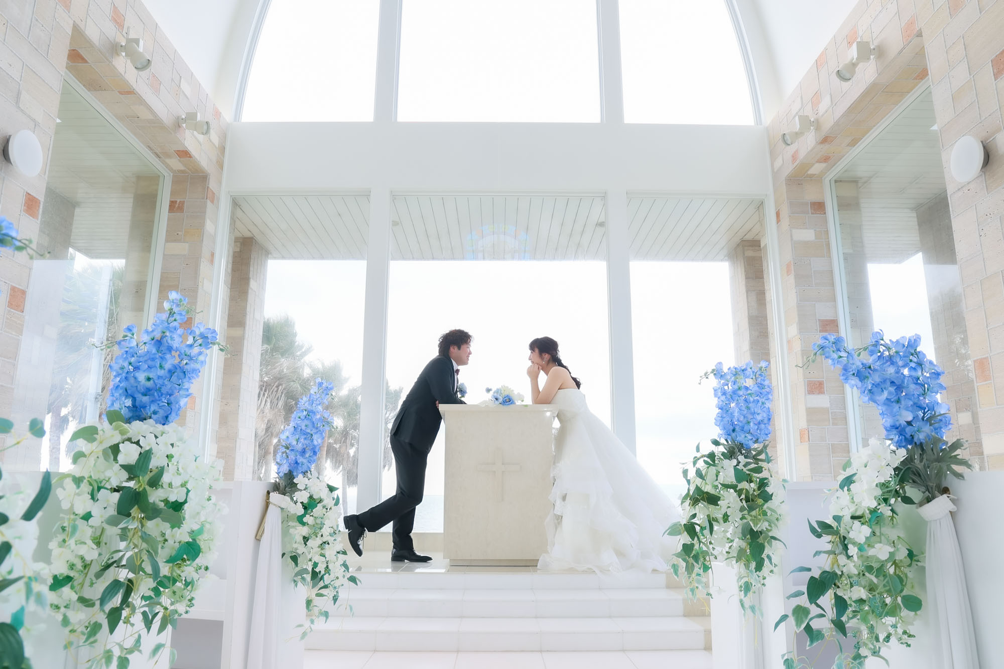 爽やかな笑顔がとっても優しいお二人とカリコリゾートチャペルでの撮影風景です 海が見えるチャペルの真ん中で見...