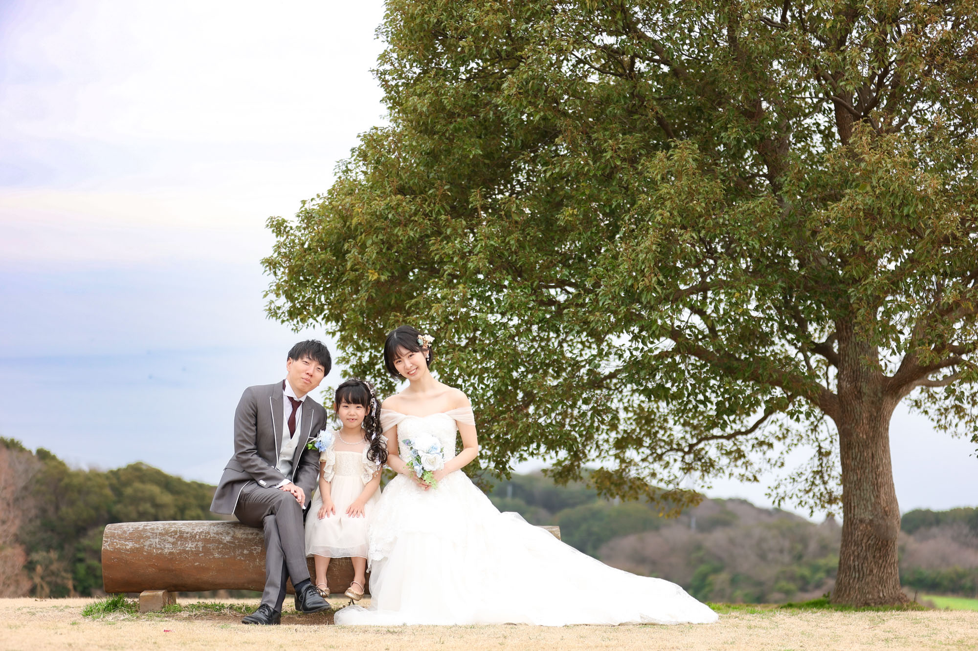 春の暖かい陽気の中菜の花畑の中でウエディングロケーション撮影です 大好きなパパとママに駆...