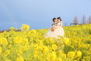 春の暖かい陽気の中菜の花畑の中でウエディングロケーション撮影です 大好きなパパとママに...
