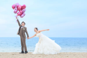 和装スタジオ撮影&ビーチサンセットウェディングドレスロケーション撮影