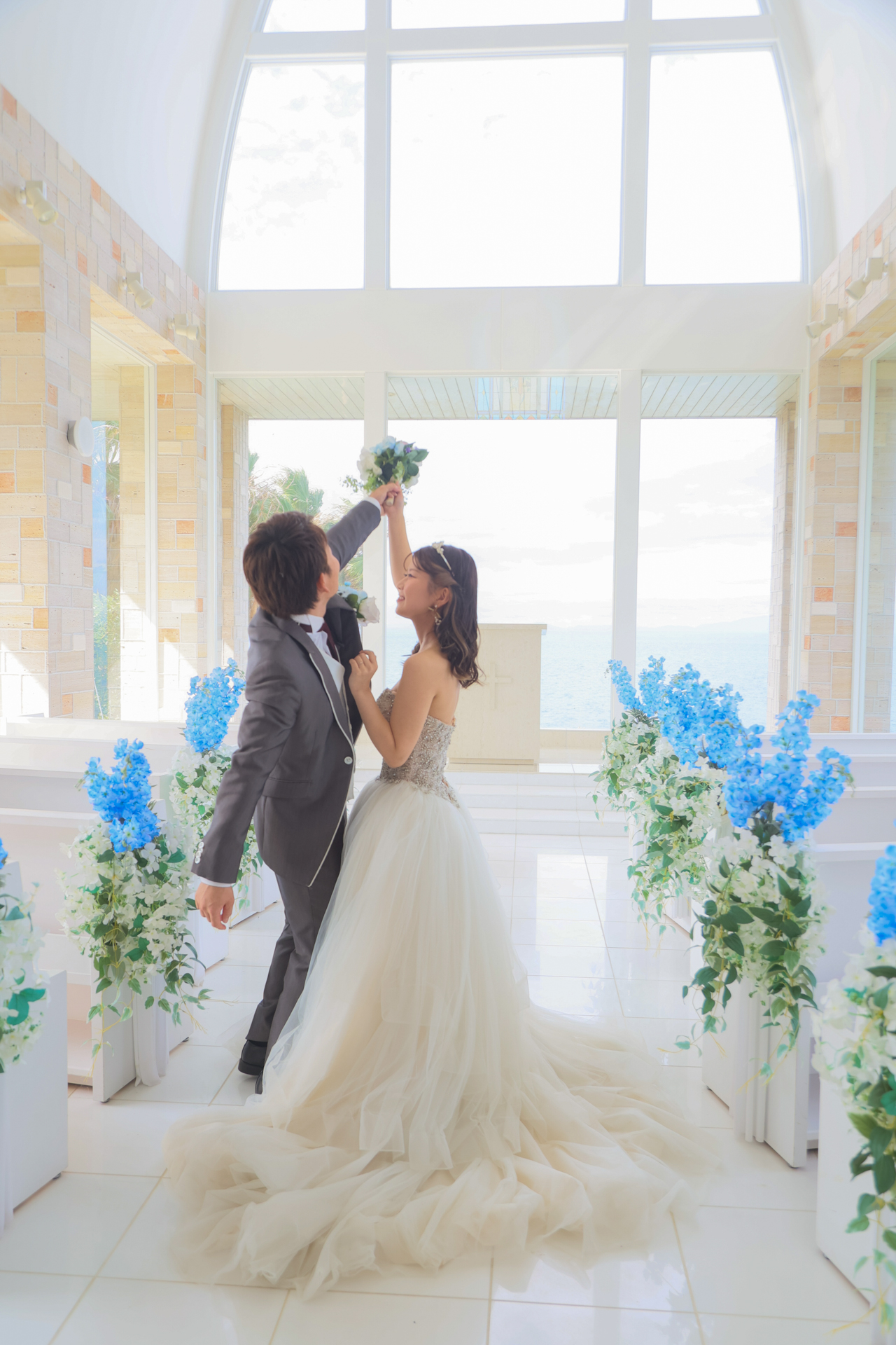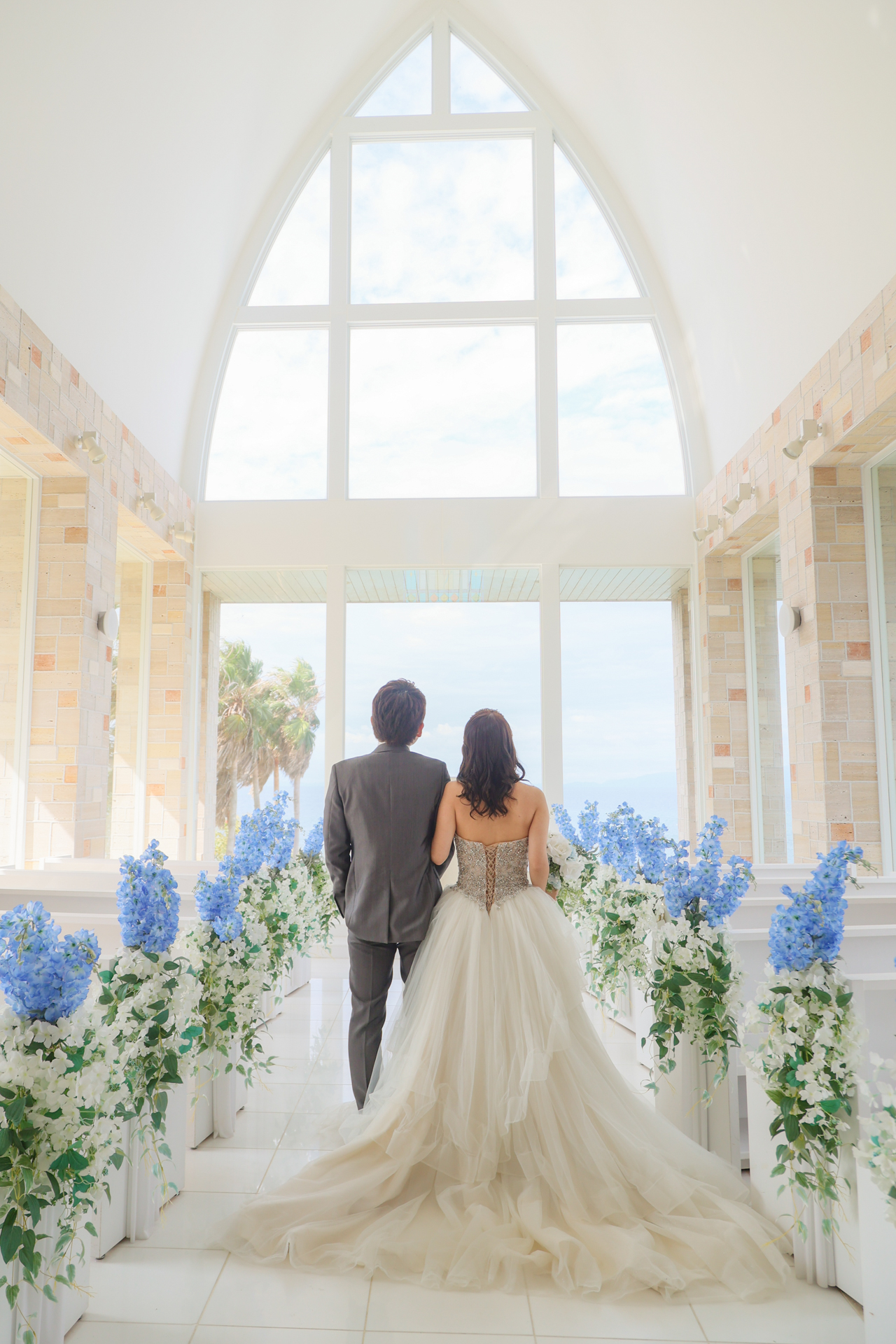 海の見える可愛いチャペルでウエディングロケーション撮影です♡バージンロードに立つ素敵な後ろ姿