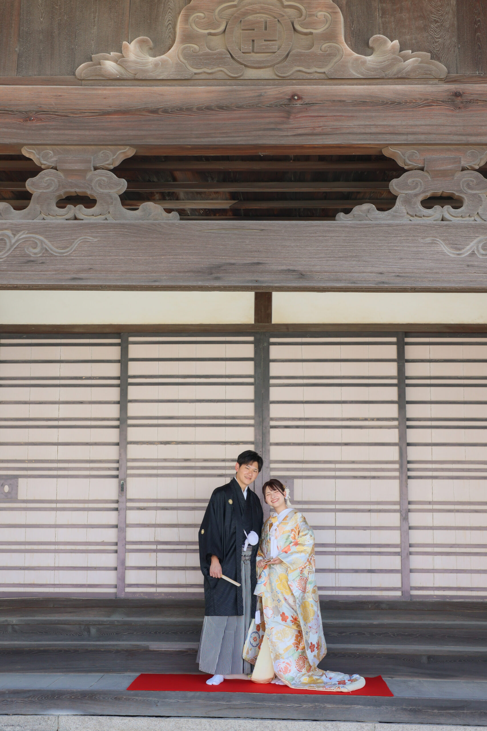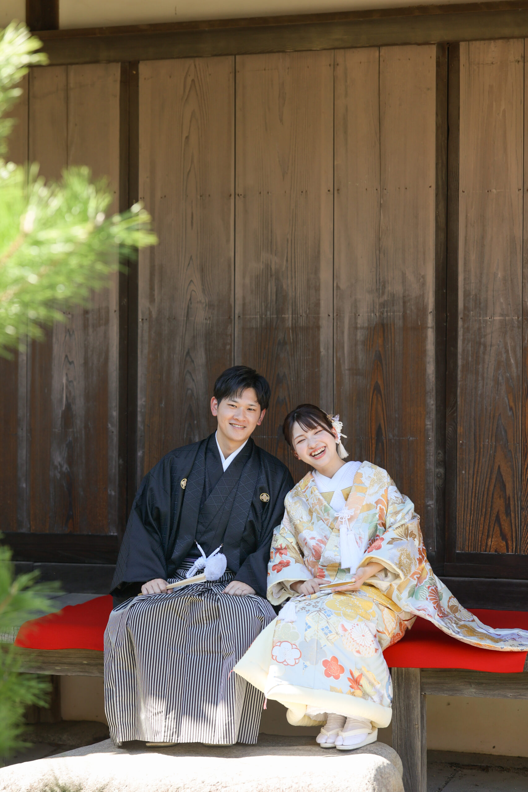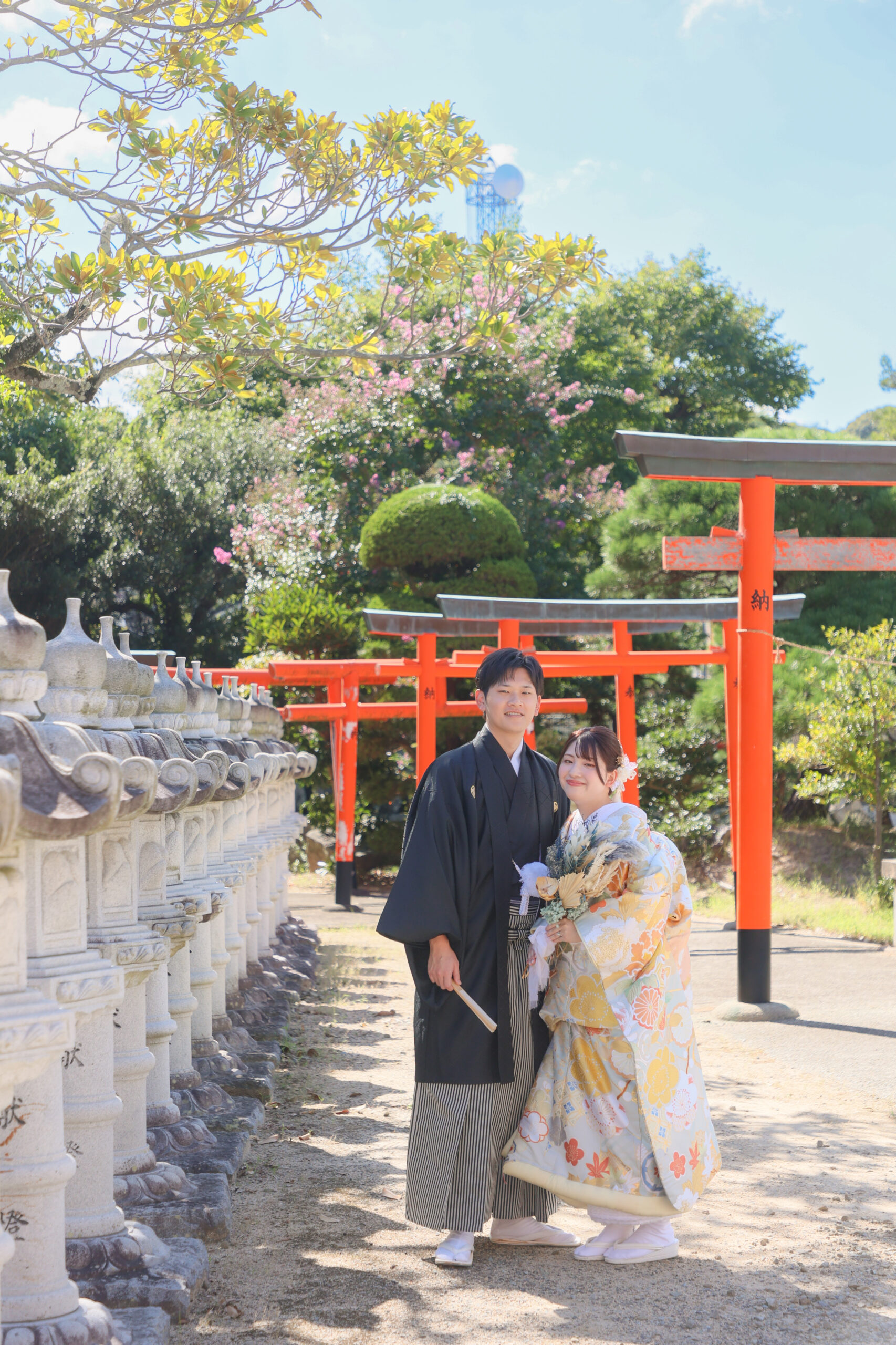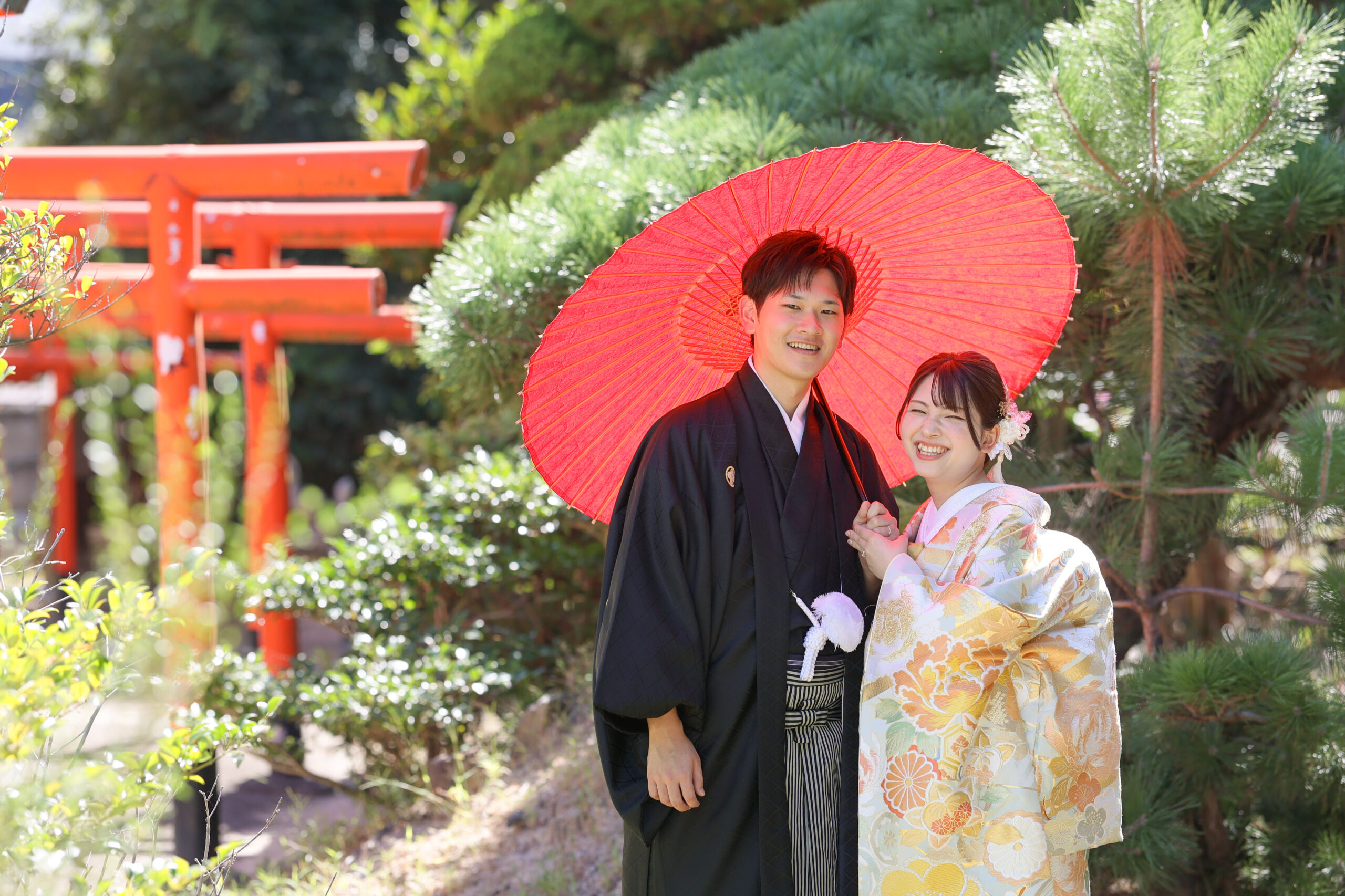 楽しそうな笑顔が印象的なお二人と神社で撮影の様子です