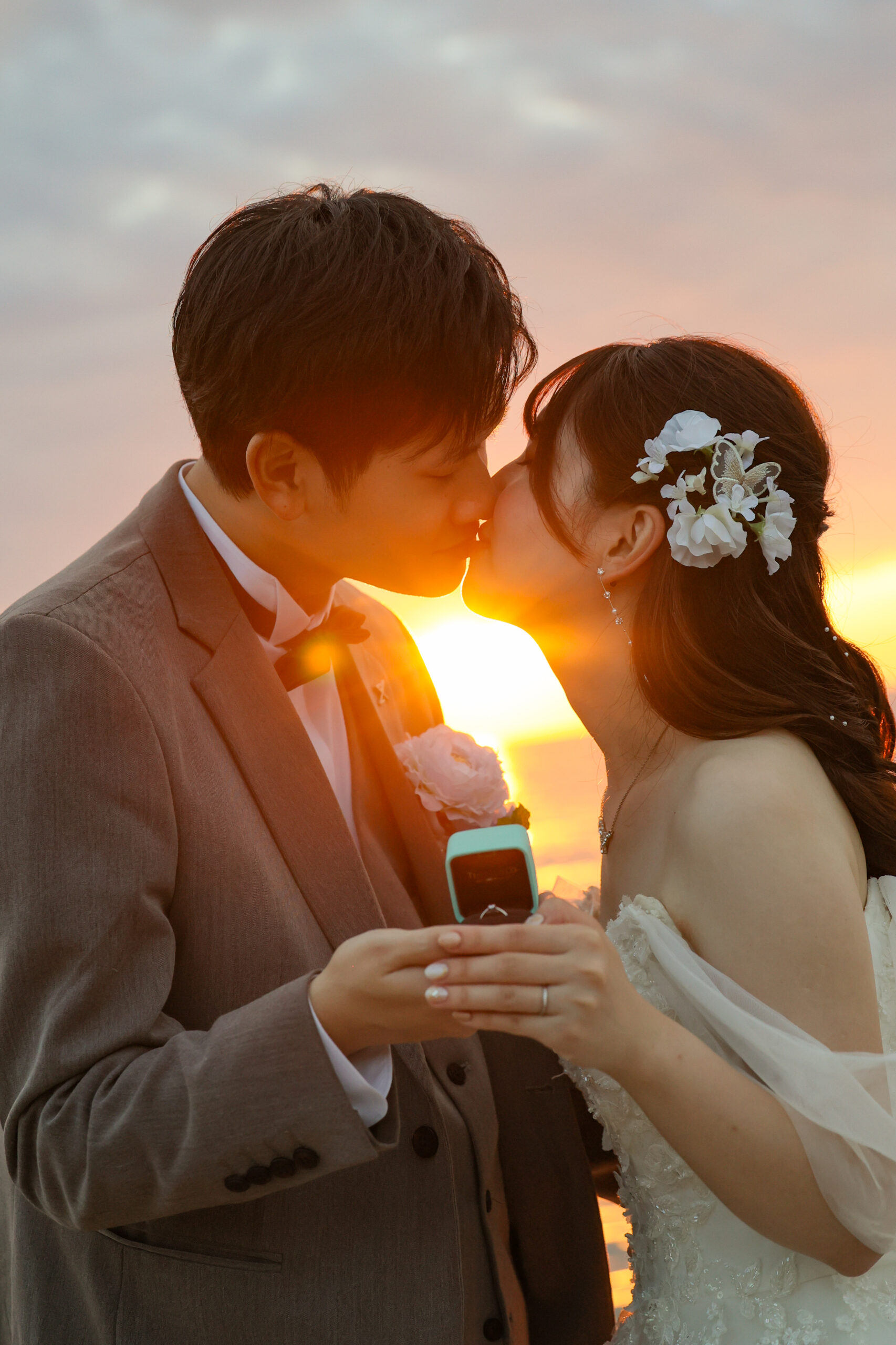 日が沈む時間のビーチではドレス姿での撮影です♡ロマンチックな雰囲気ですね