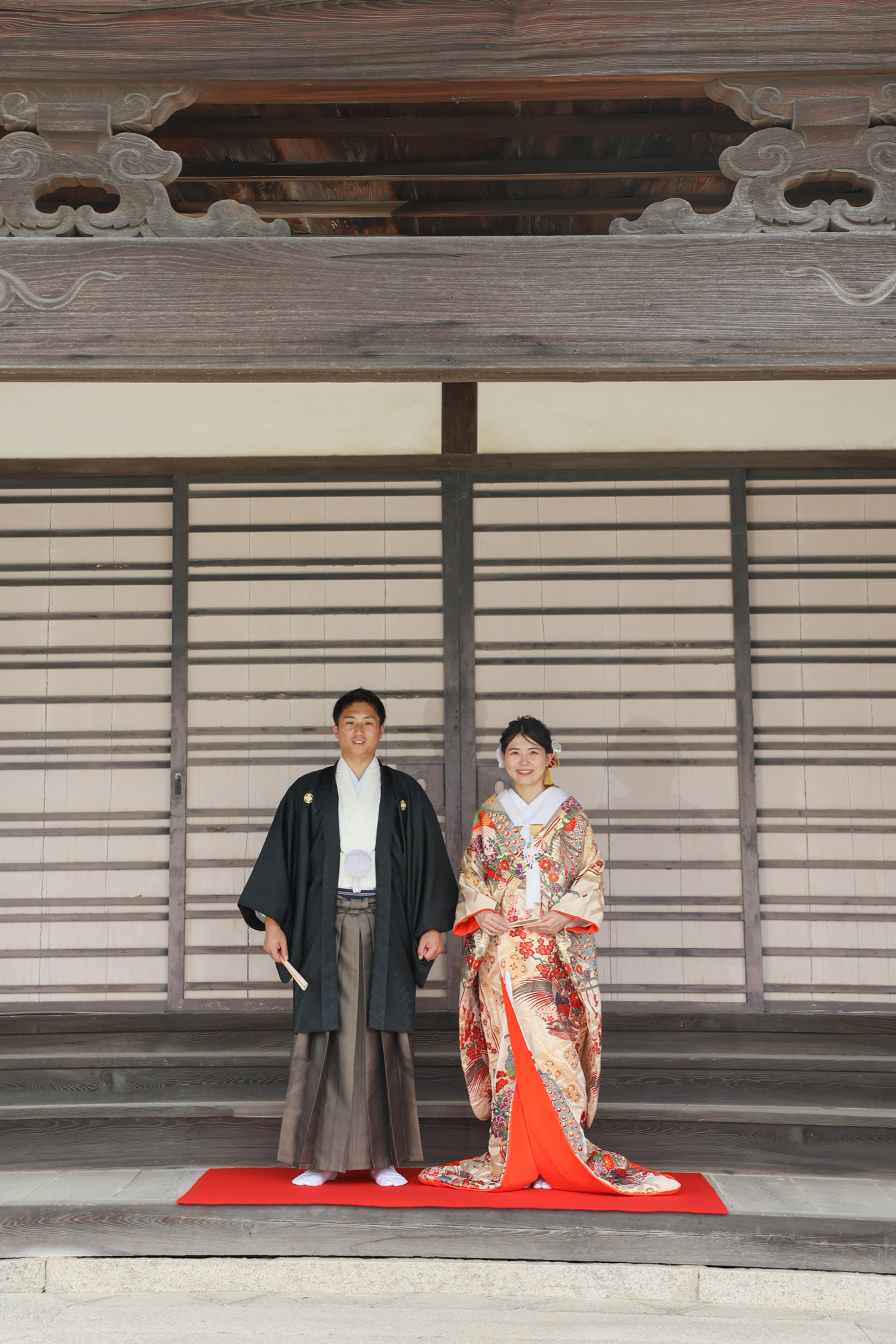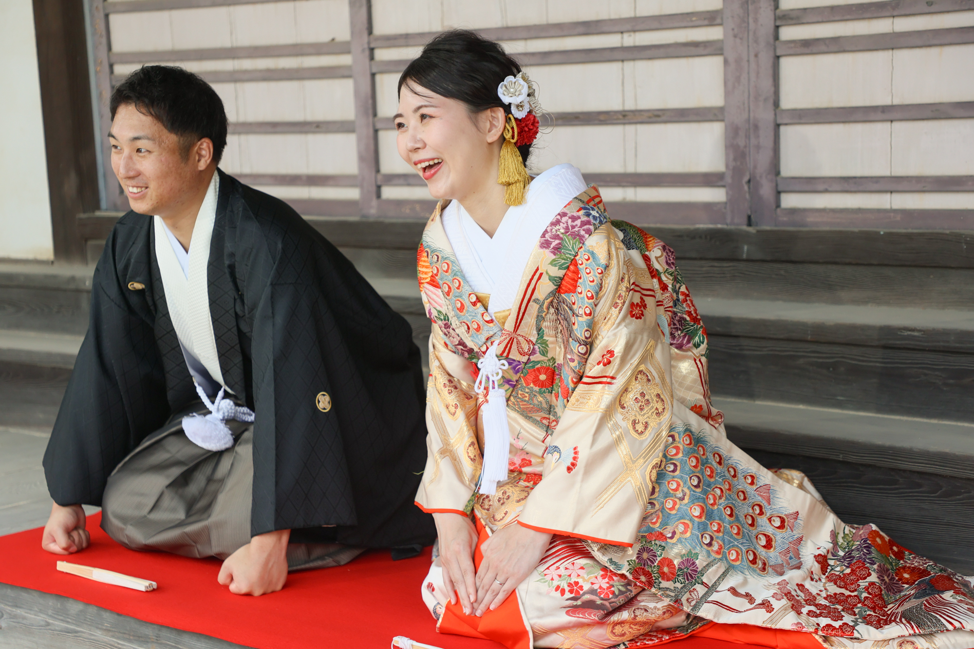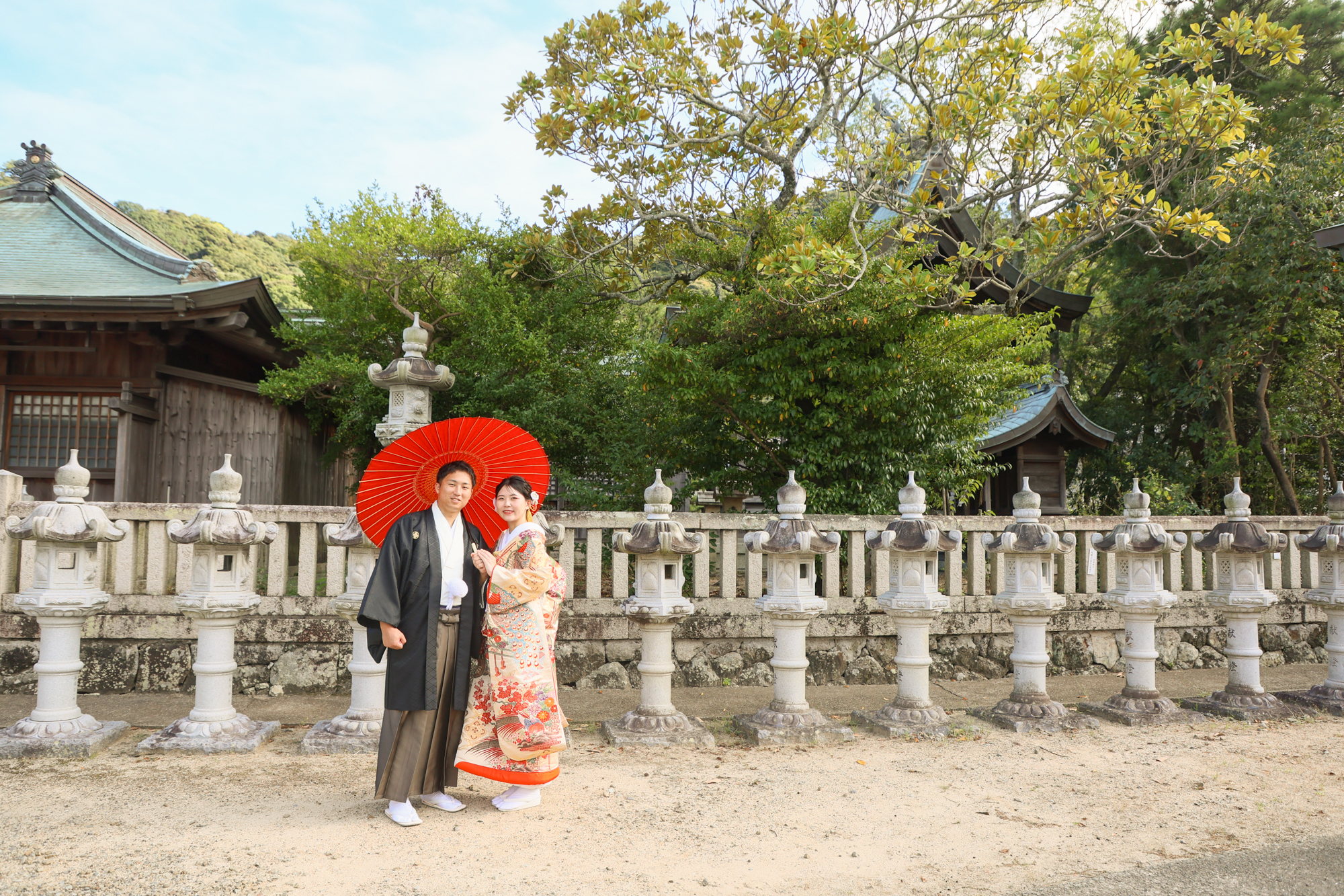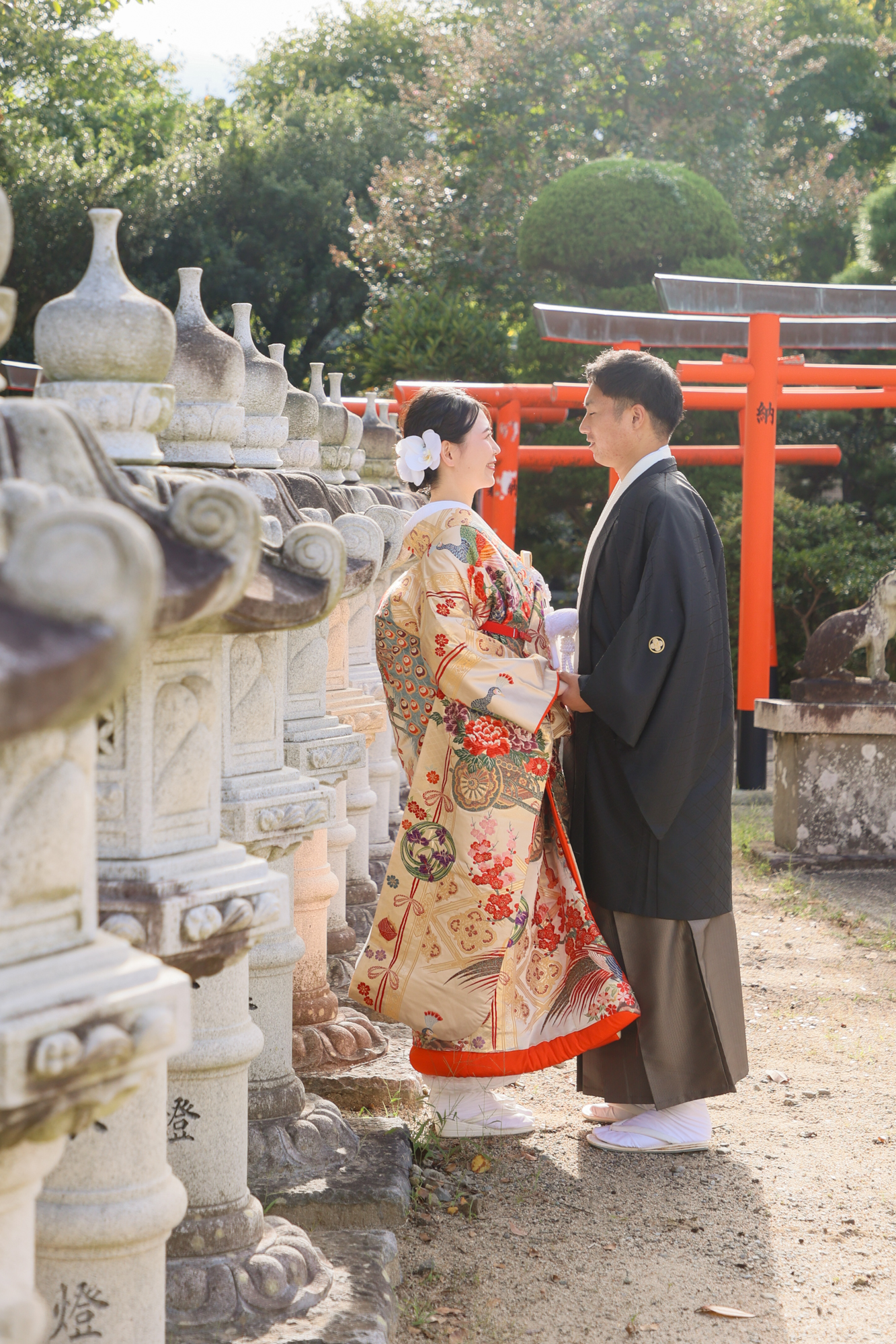 秋晴れの美しい神社の中和装姿のお二人とロケーション撮影の様子です