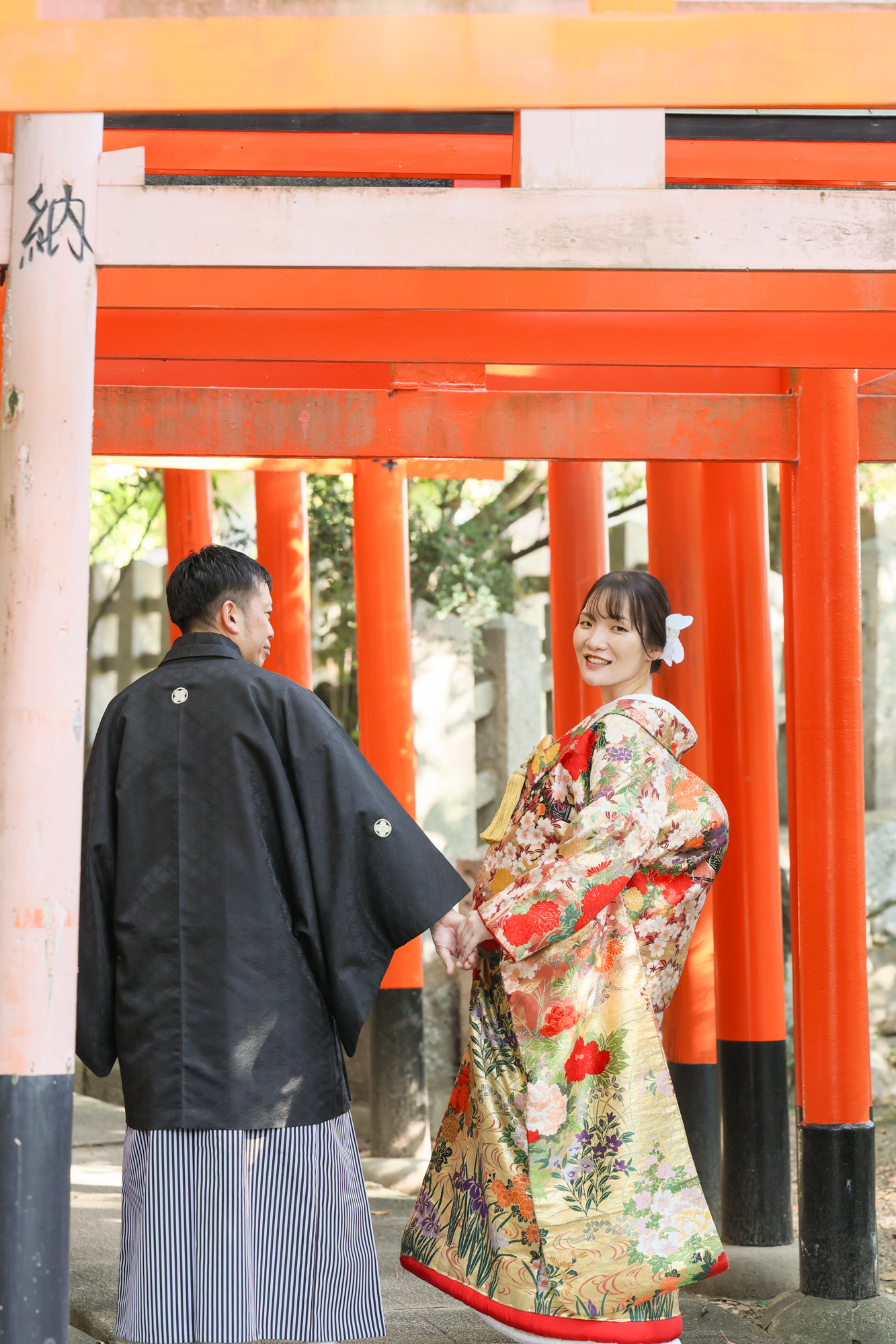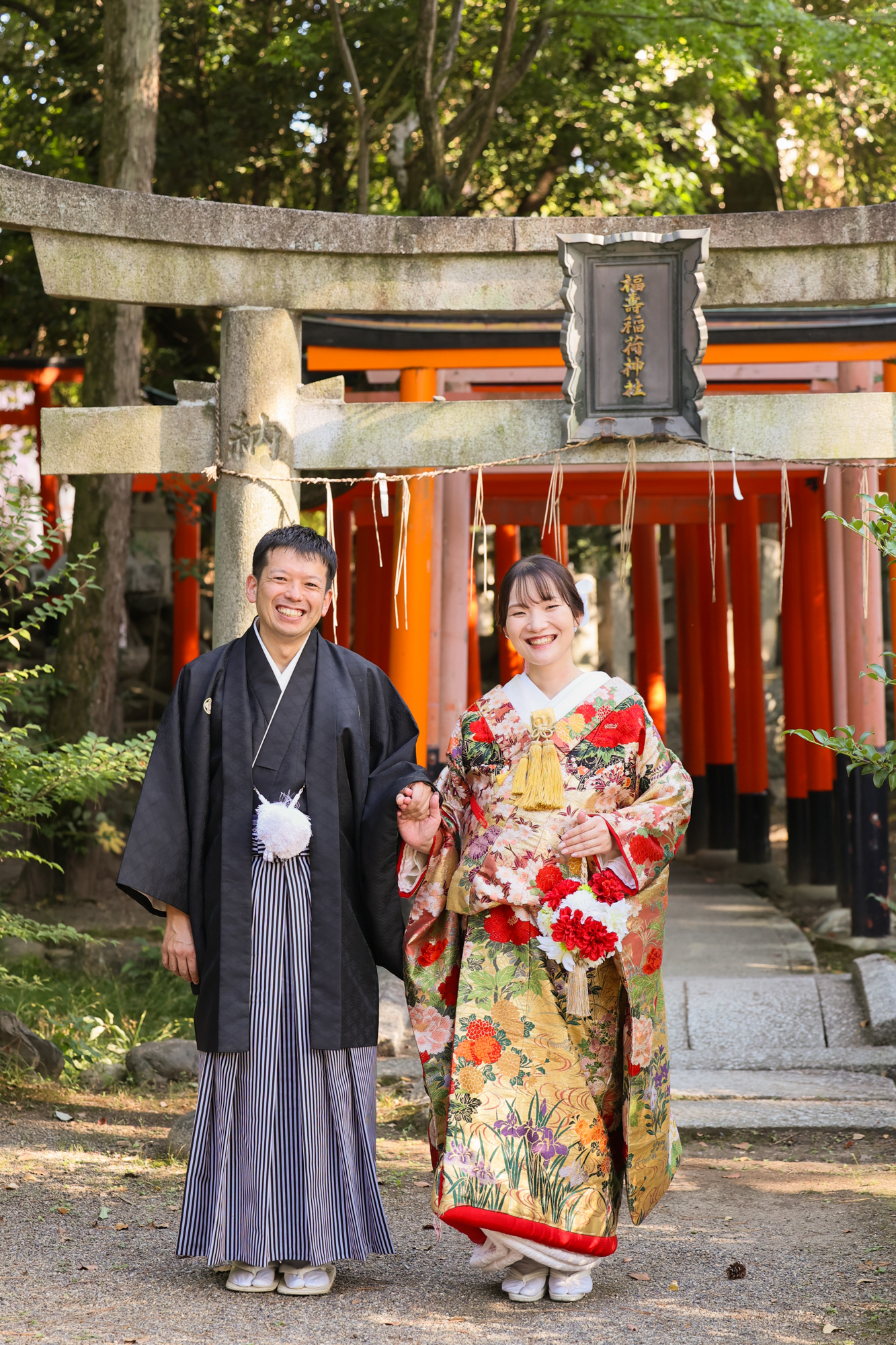 赤い鳥居がいい雰囲気の中で笑顔のお二人がいい感じ