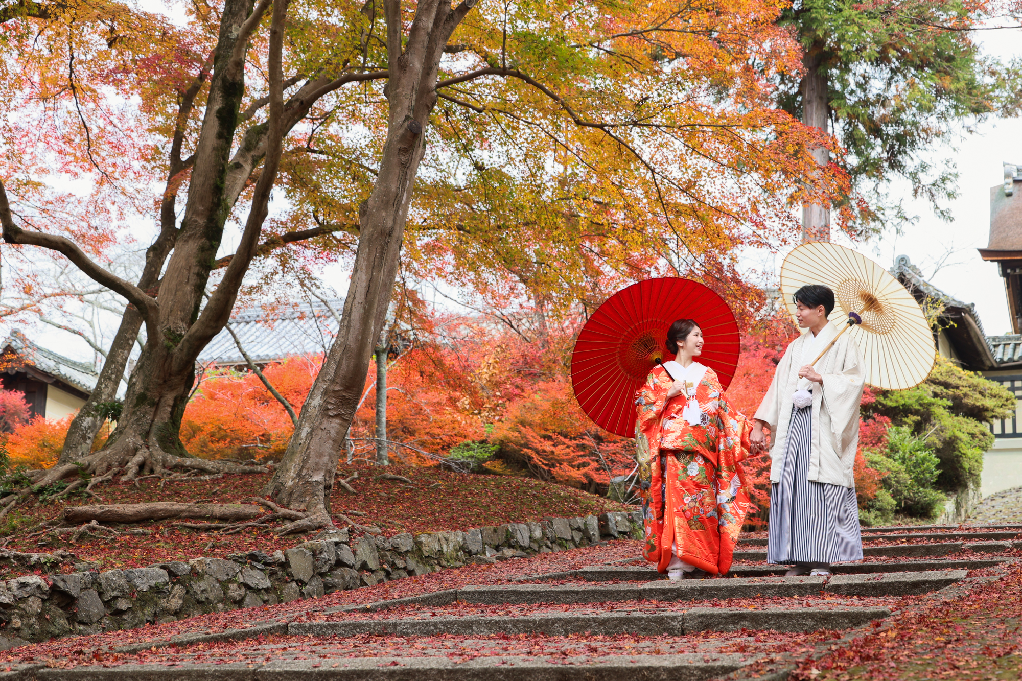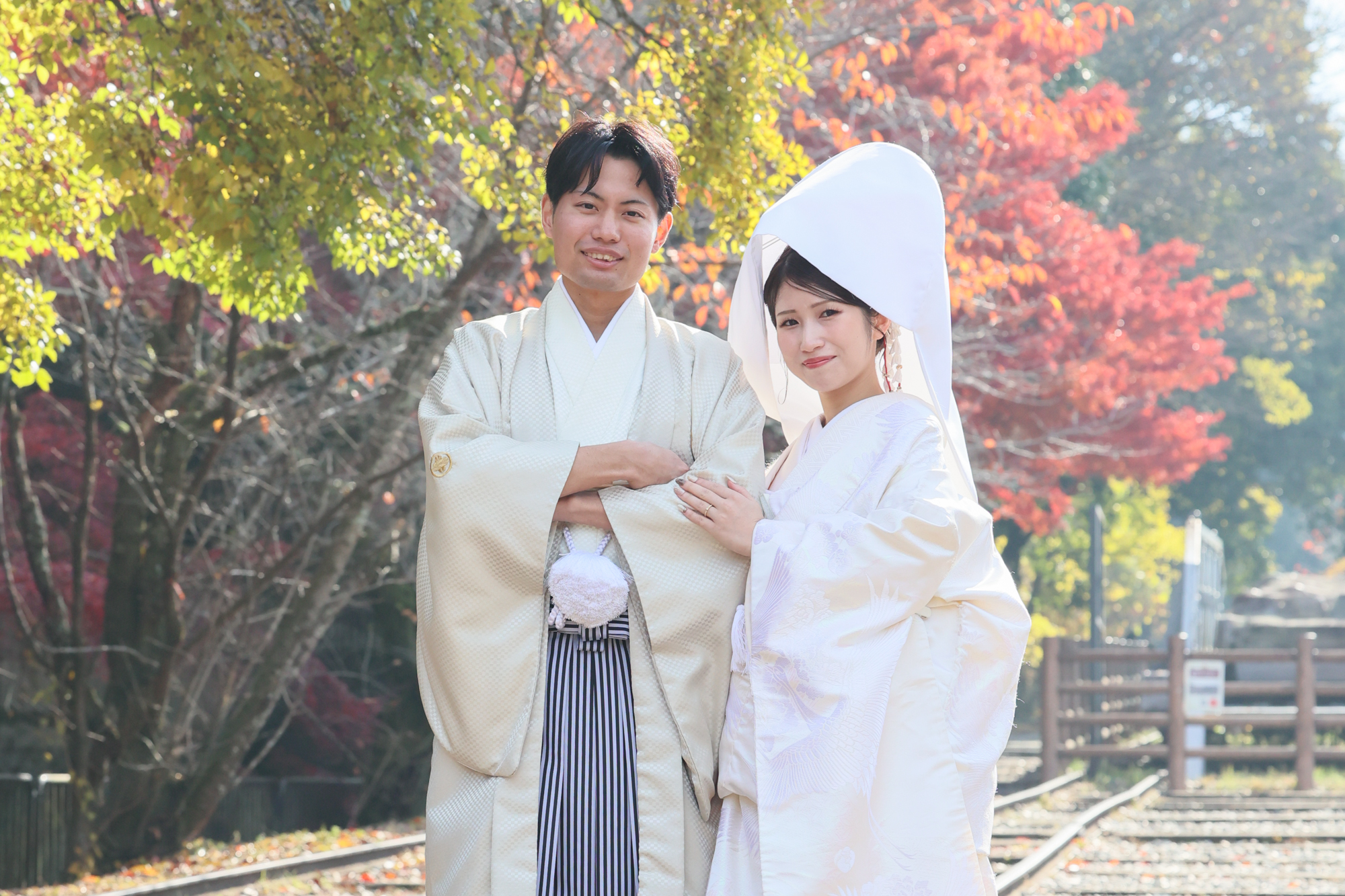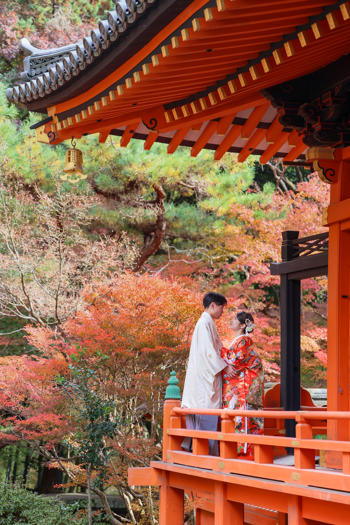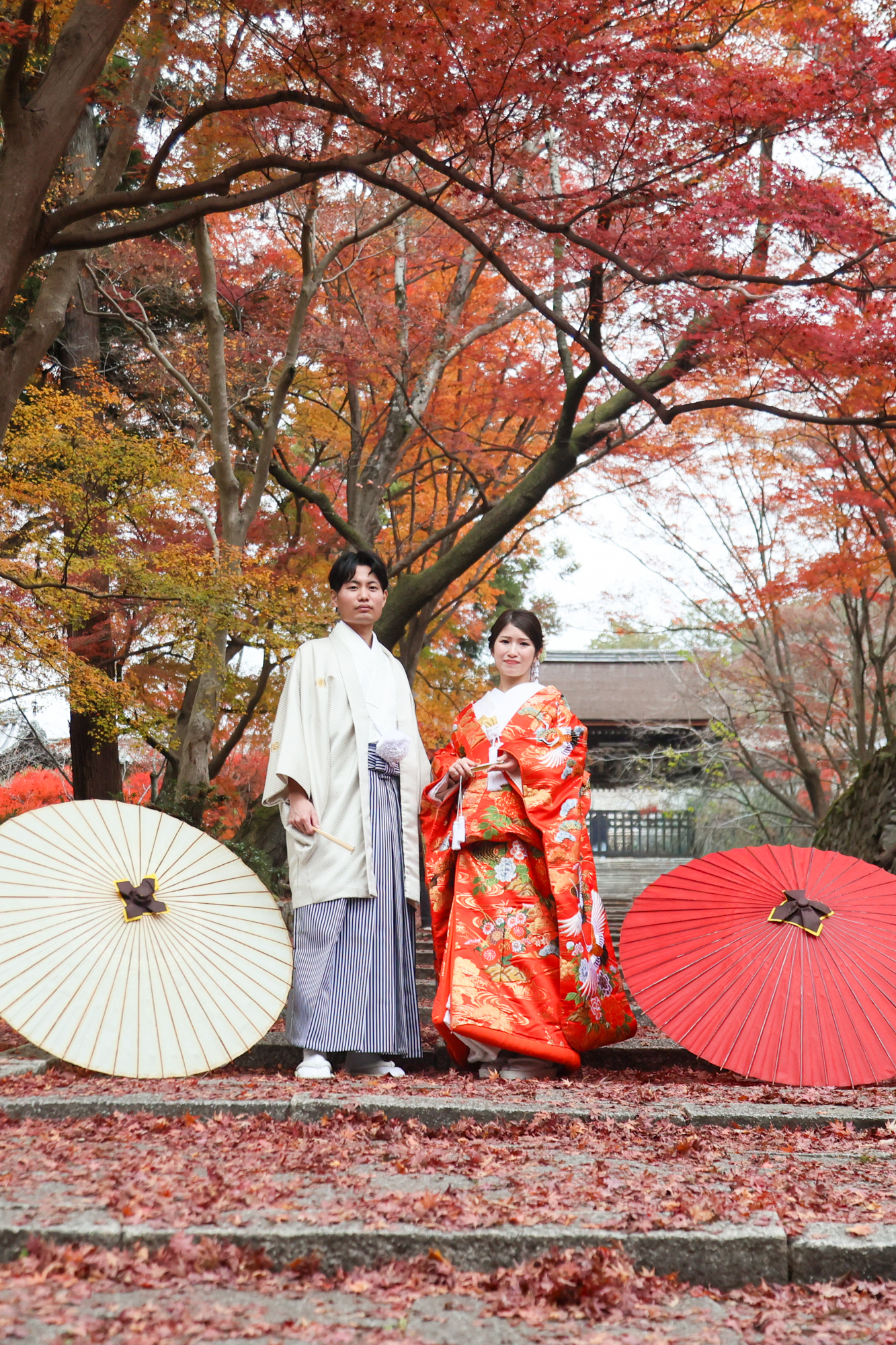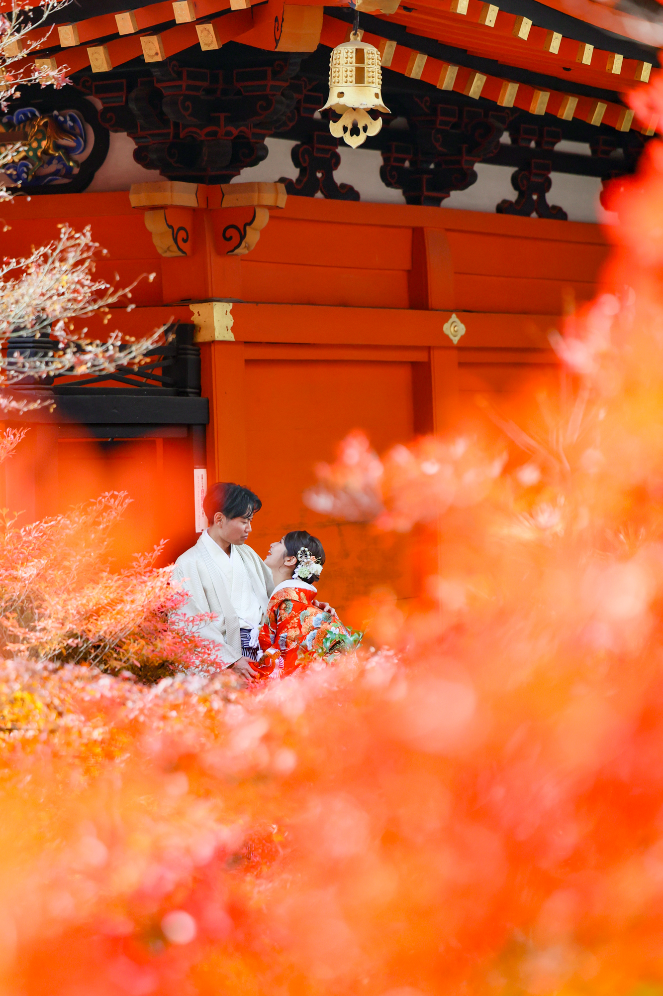幻想的な紅葉が広がる風景の中ロマンチックな和装撮影の様子です