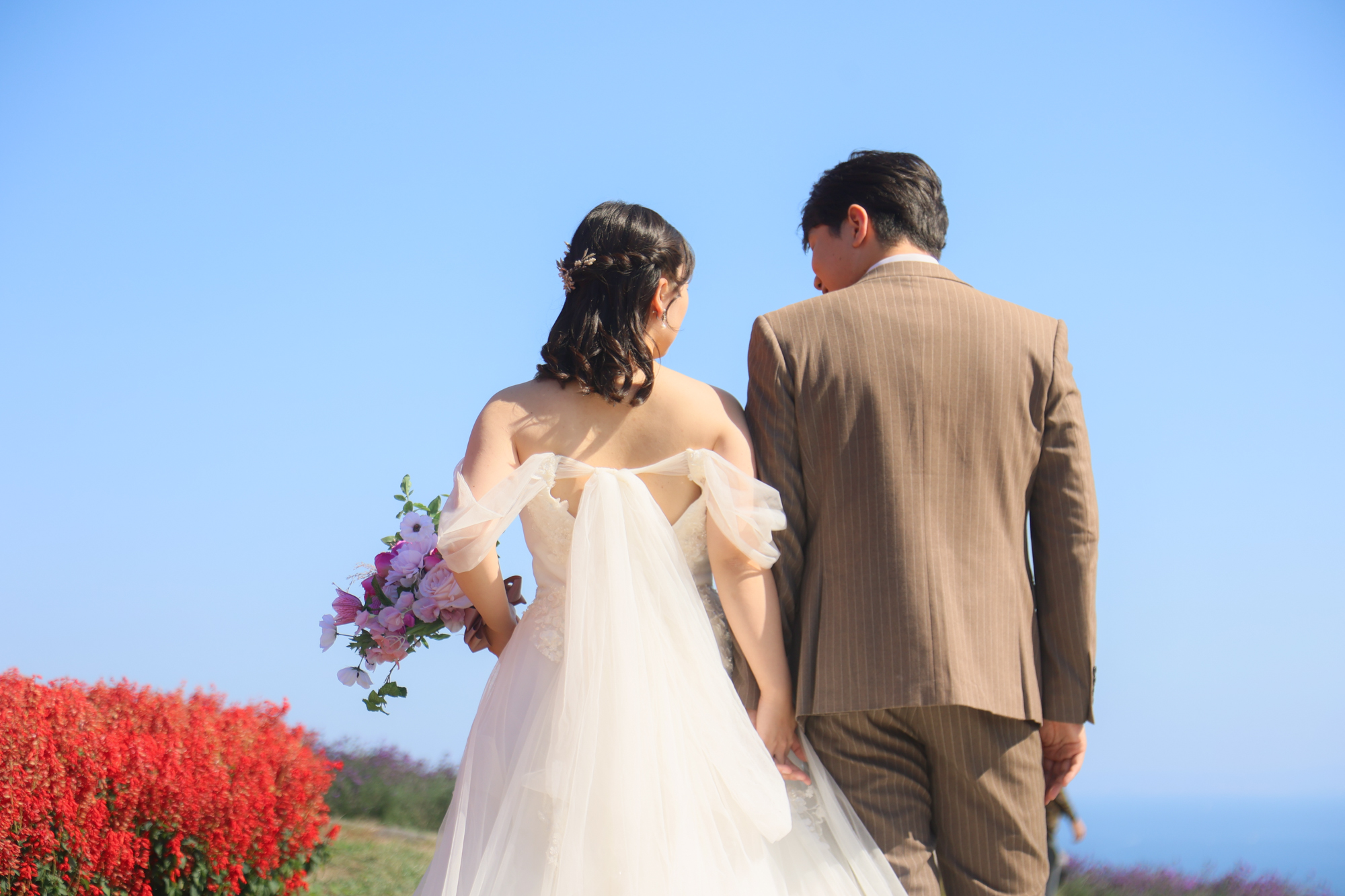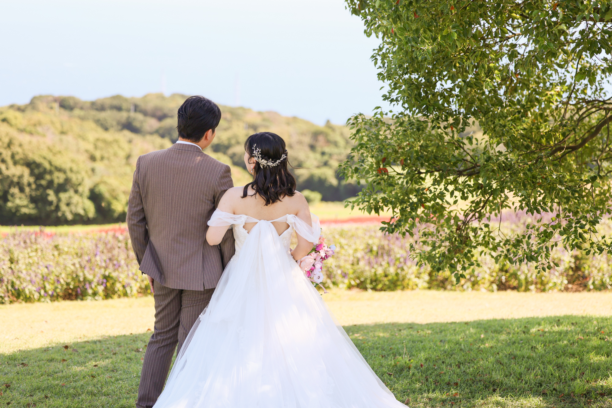 自然豊かなあわじ花さじきで楽しそうな背中が可愛いお二人とロケーション撮影です