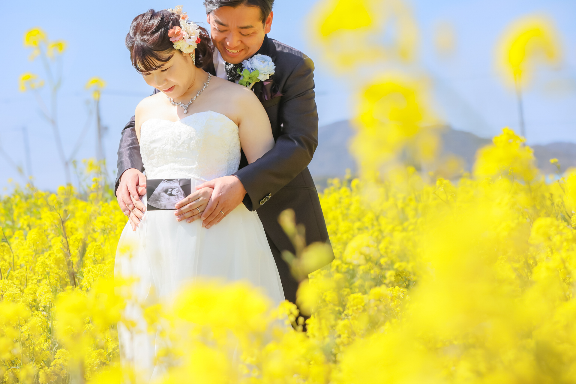 黄色い菜の花が一面を埋め尽くす様子が美しいお花畑で幸せいっぱいの撮影です