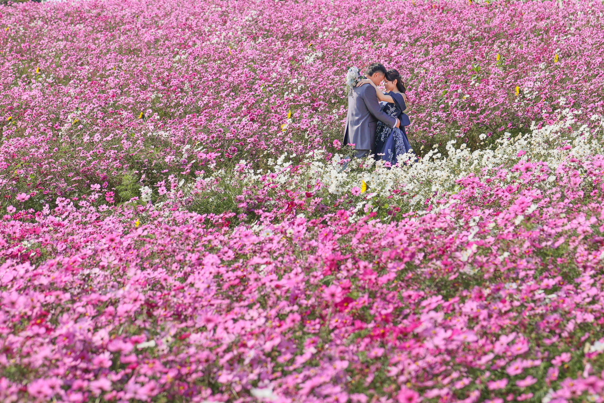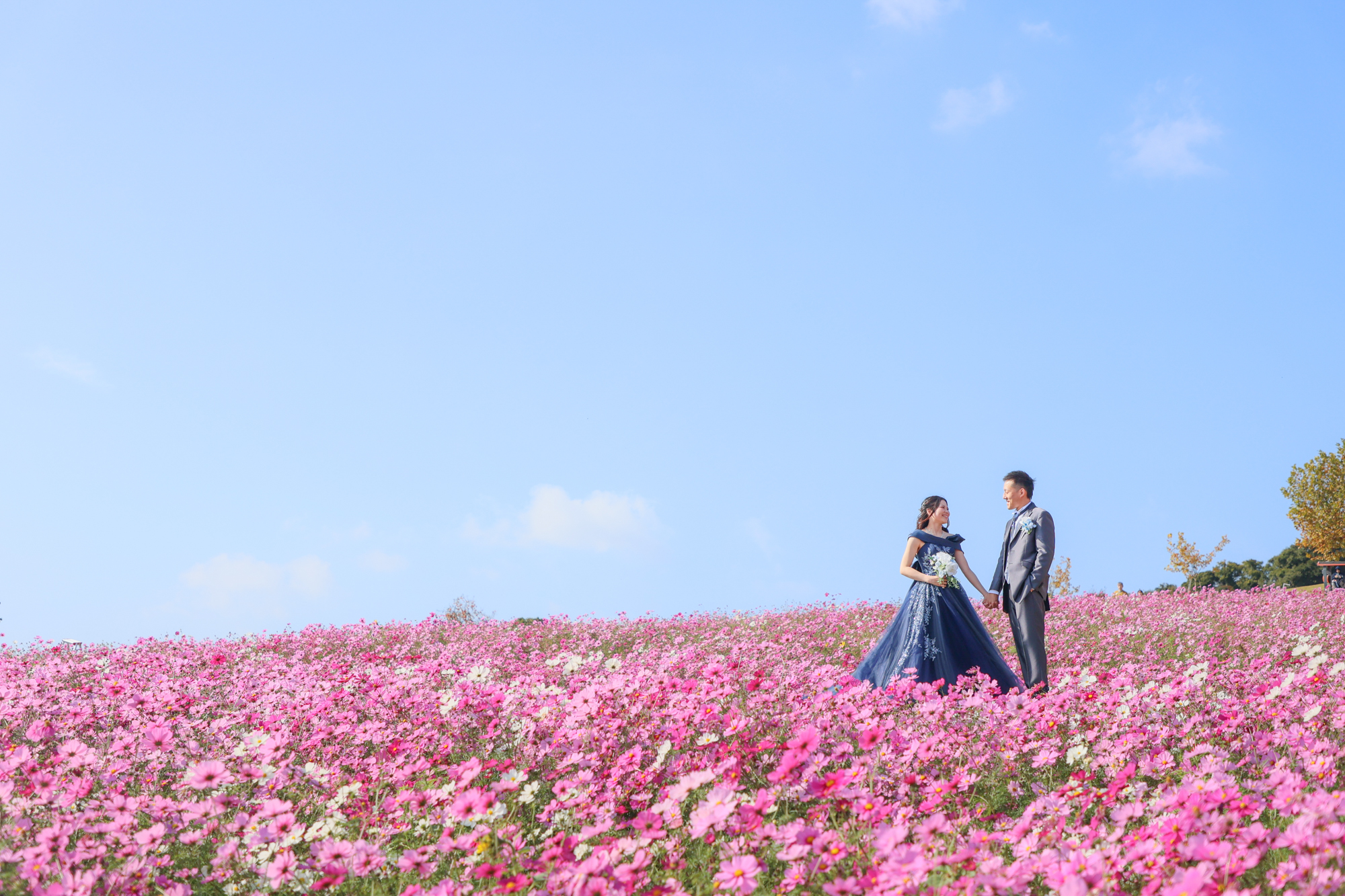 快晴の空の下辺り一面に咲くコスモスの中で見つめ合うロマンチックなあわじ花さじきでの撮影風景です