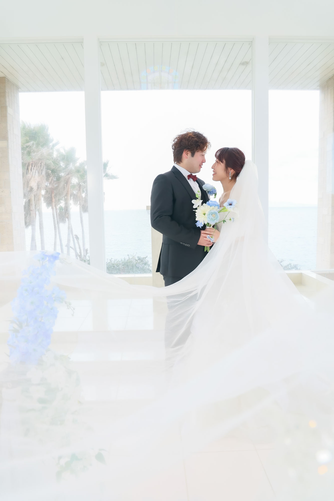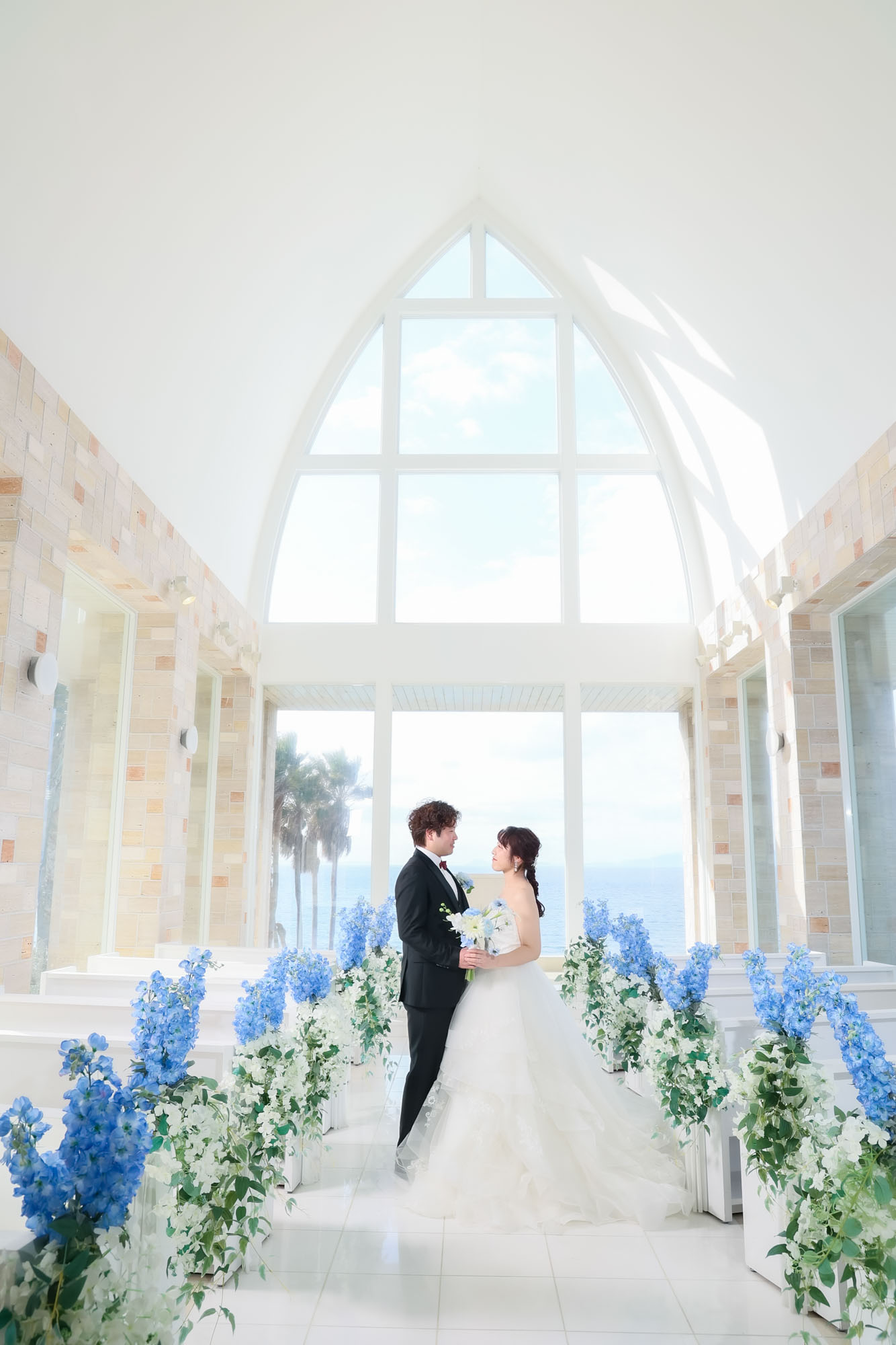 海が見えるチャペルの真ん中で見つめ合うロマンチックな様子がいい雰囲気