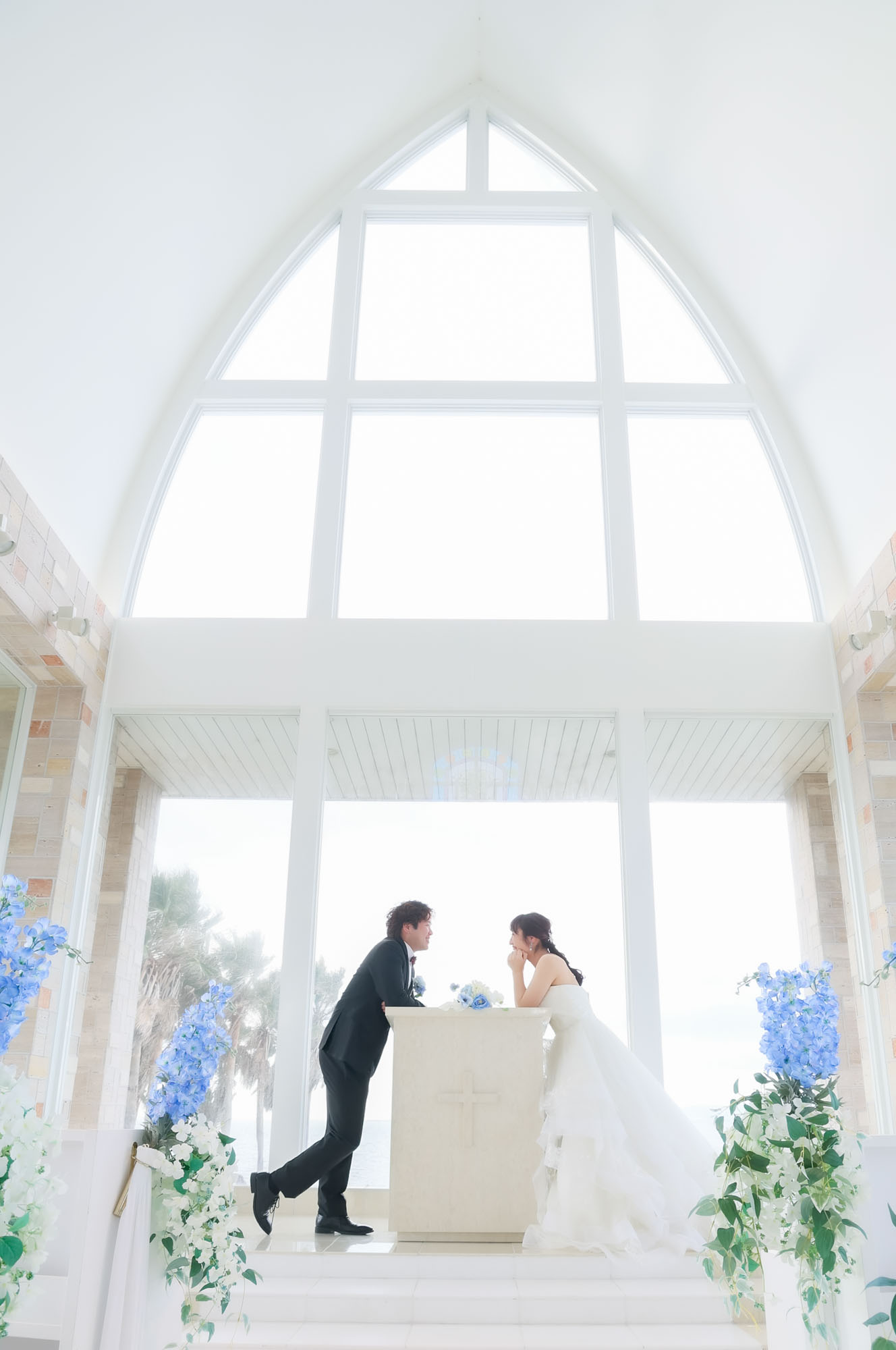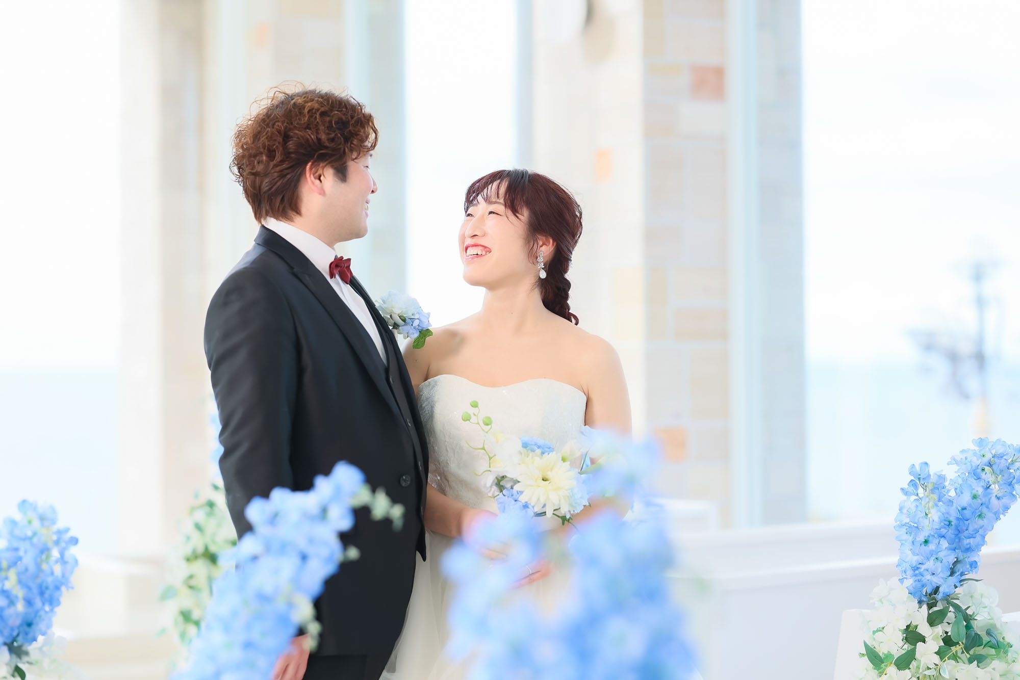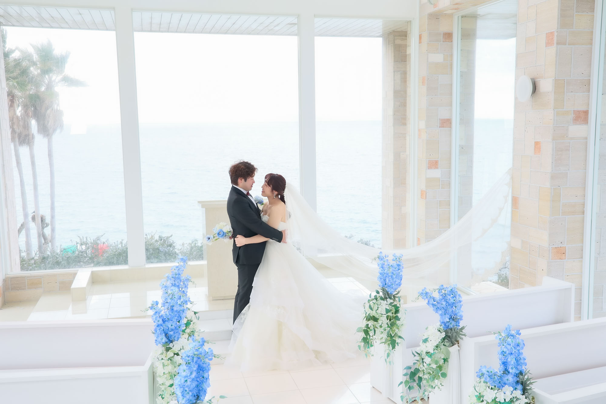 海が見えるチャペルの真ん中で見つめ合うロマンチックな様子がいい雰囲気