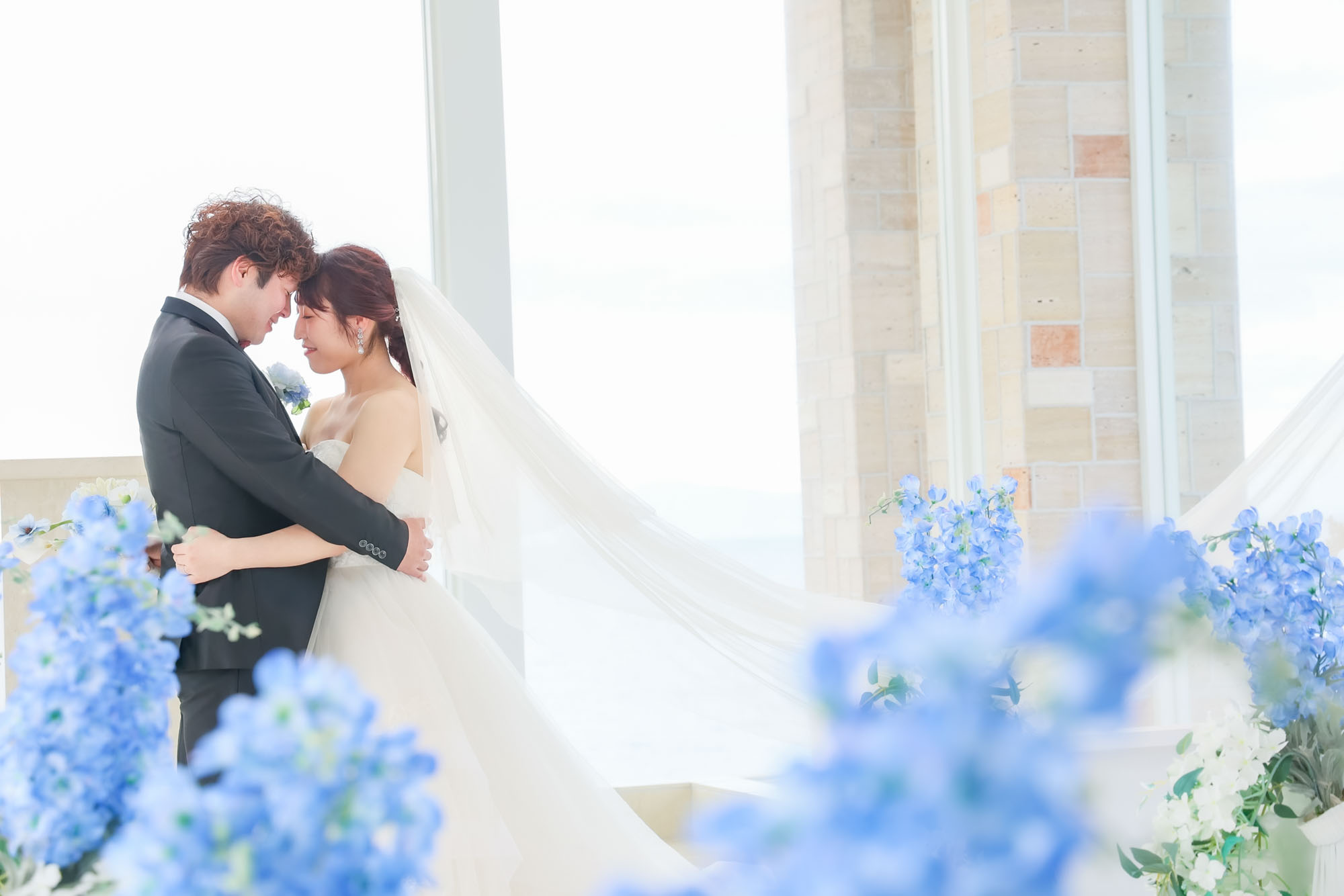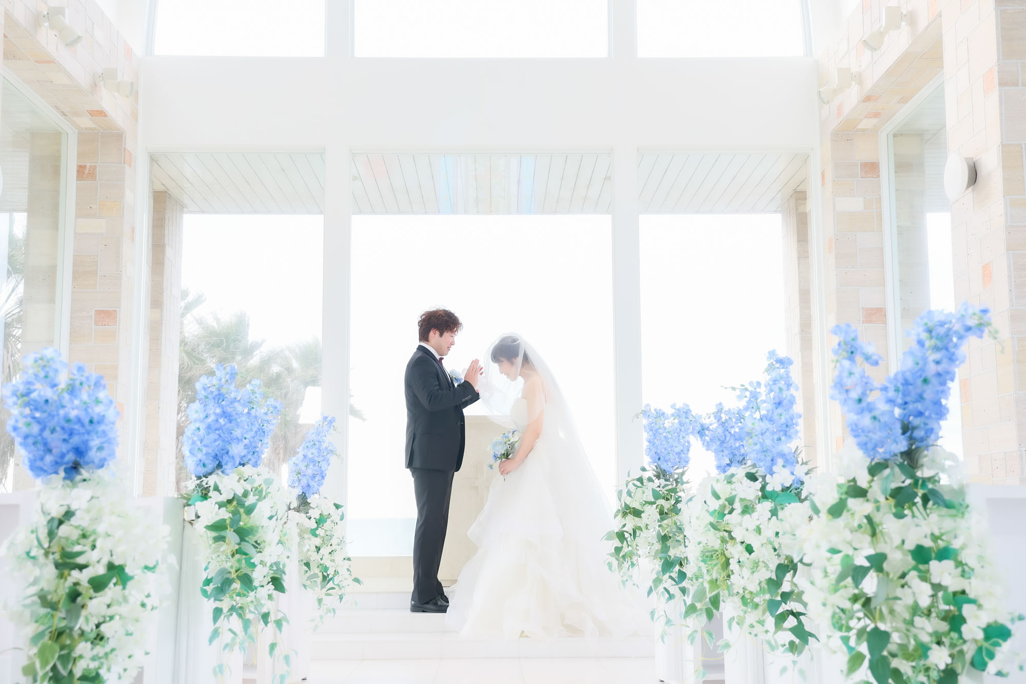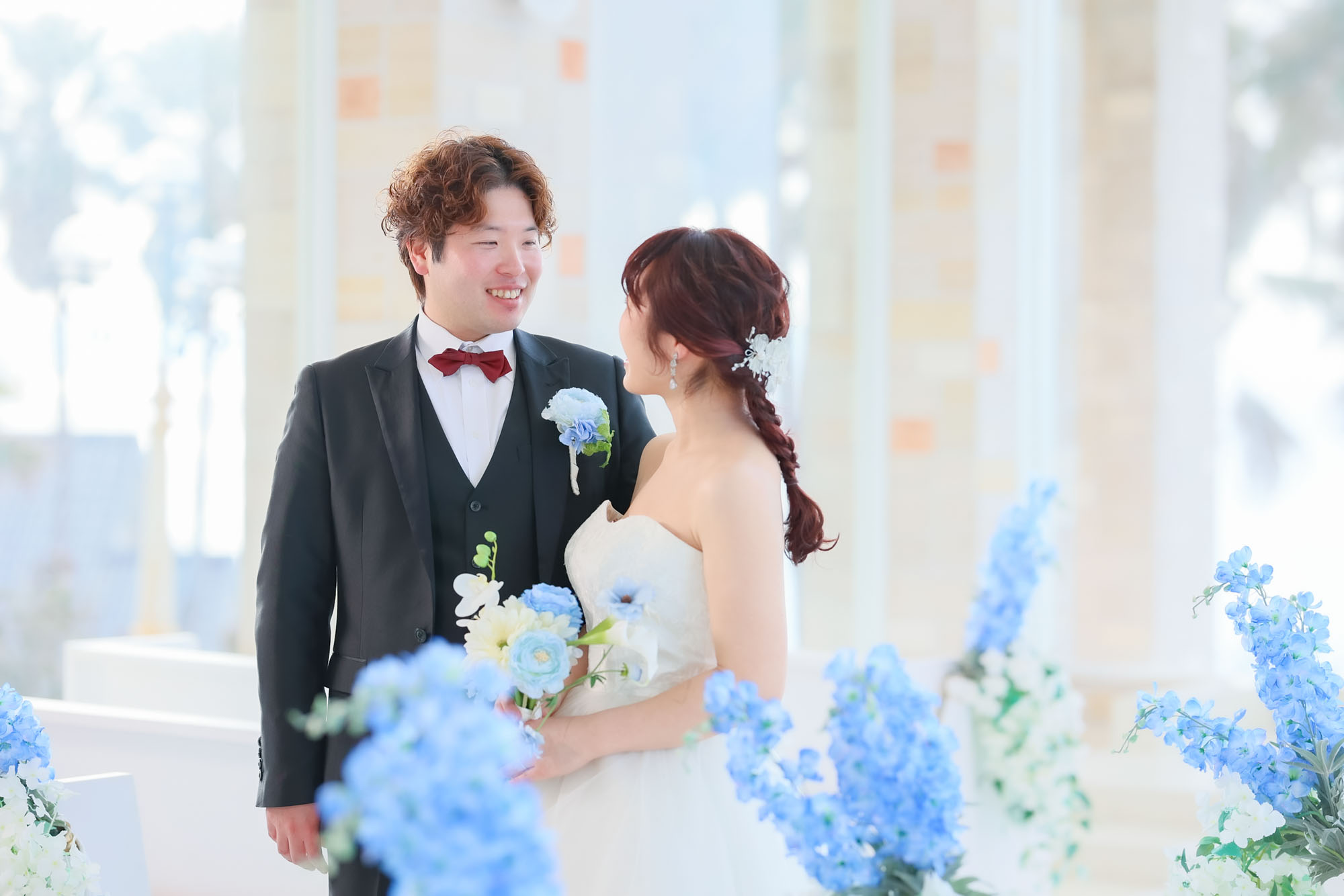 海が見えるチャペルの真ん中で見つめ合うロマンチックな様子がいい雰囲気