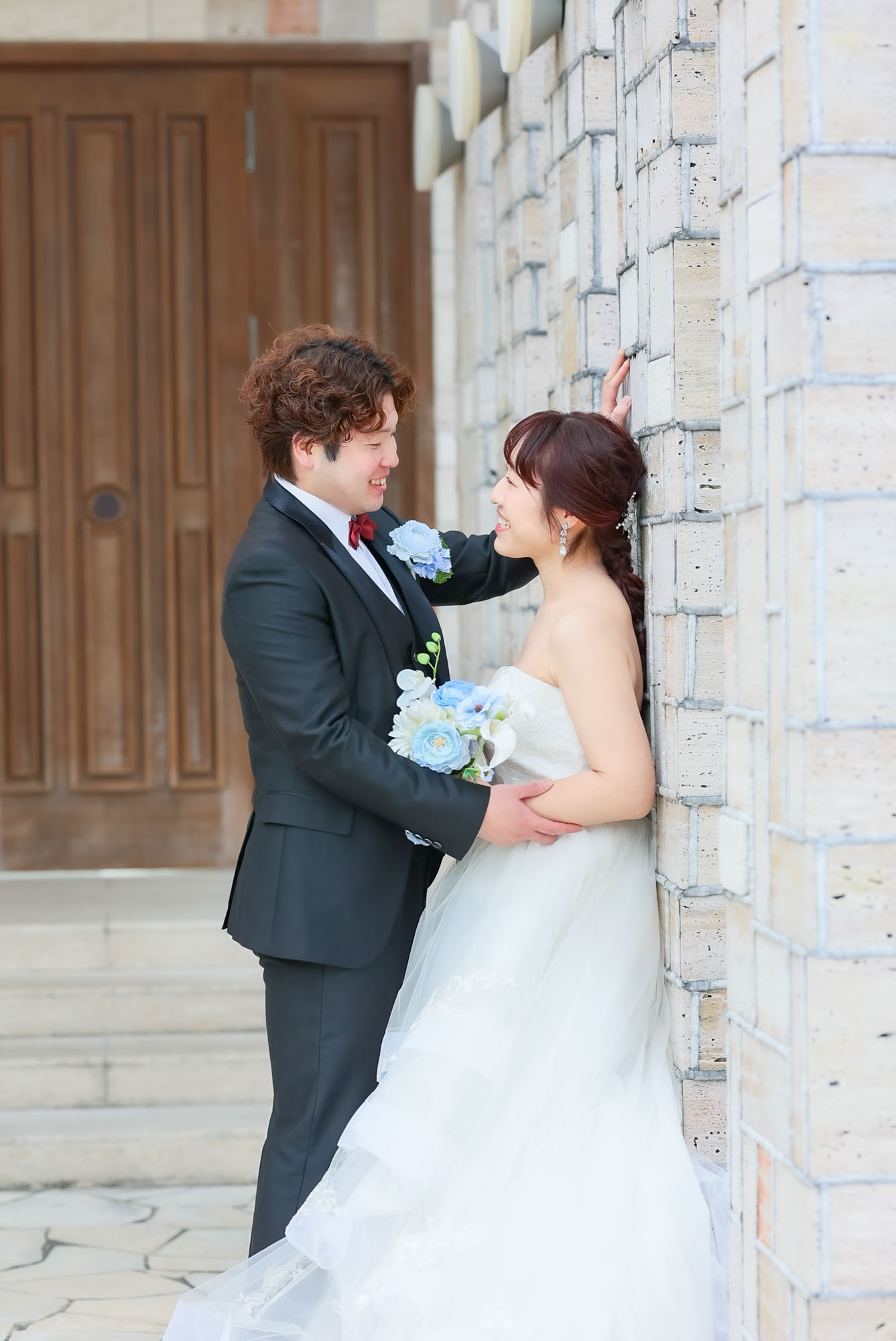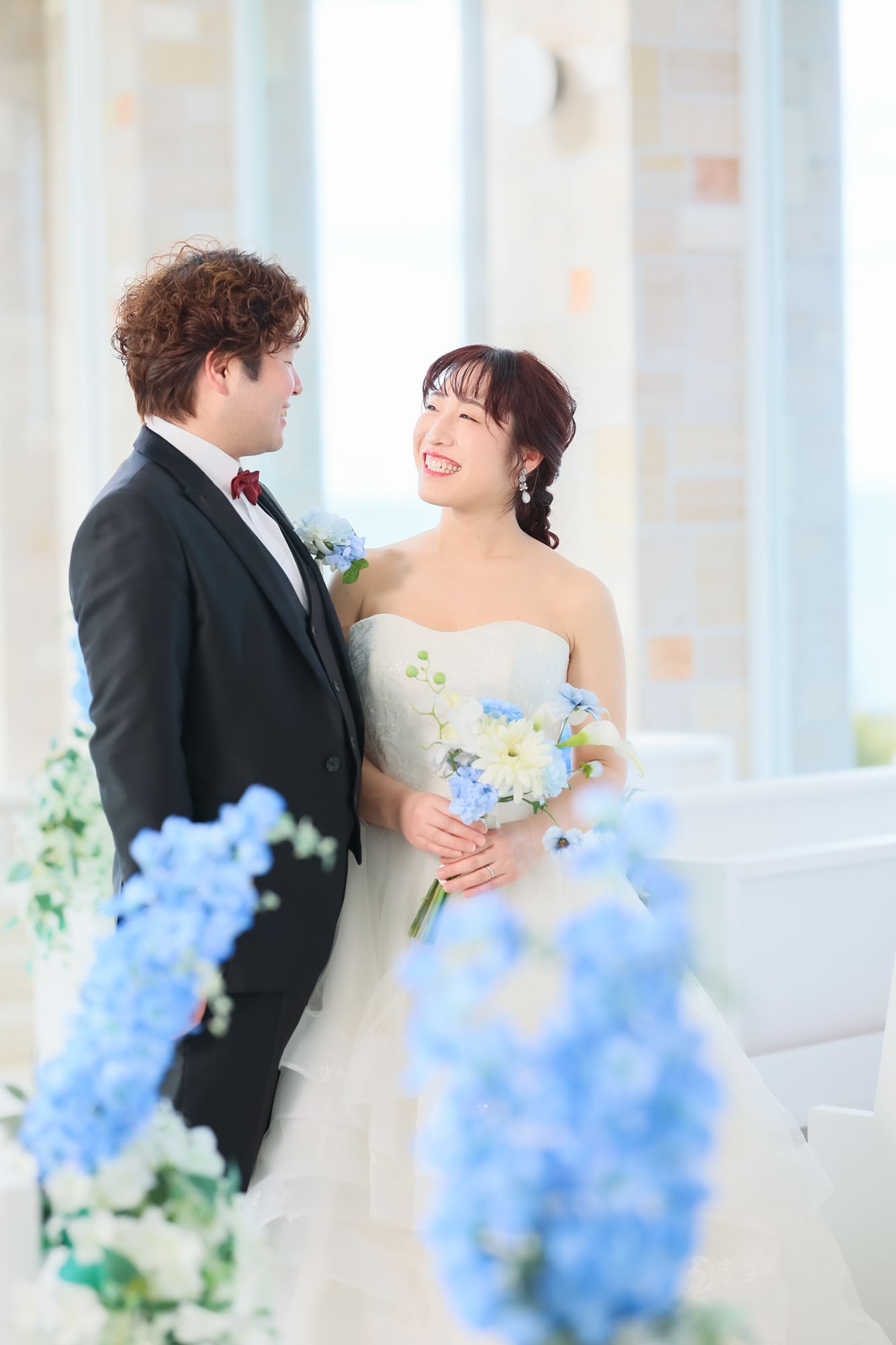 爽やかな笑顔がとっても優しいお二人とカリコリゾートチャペルでの撮影風景です