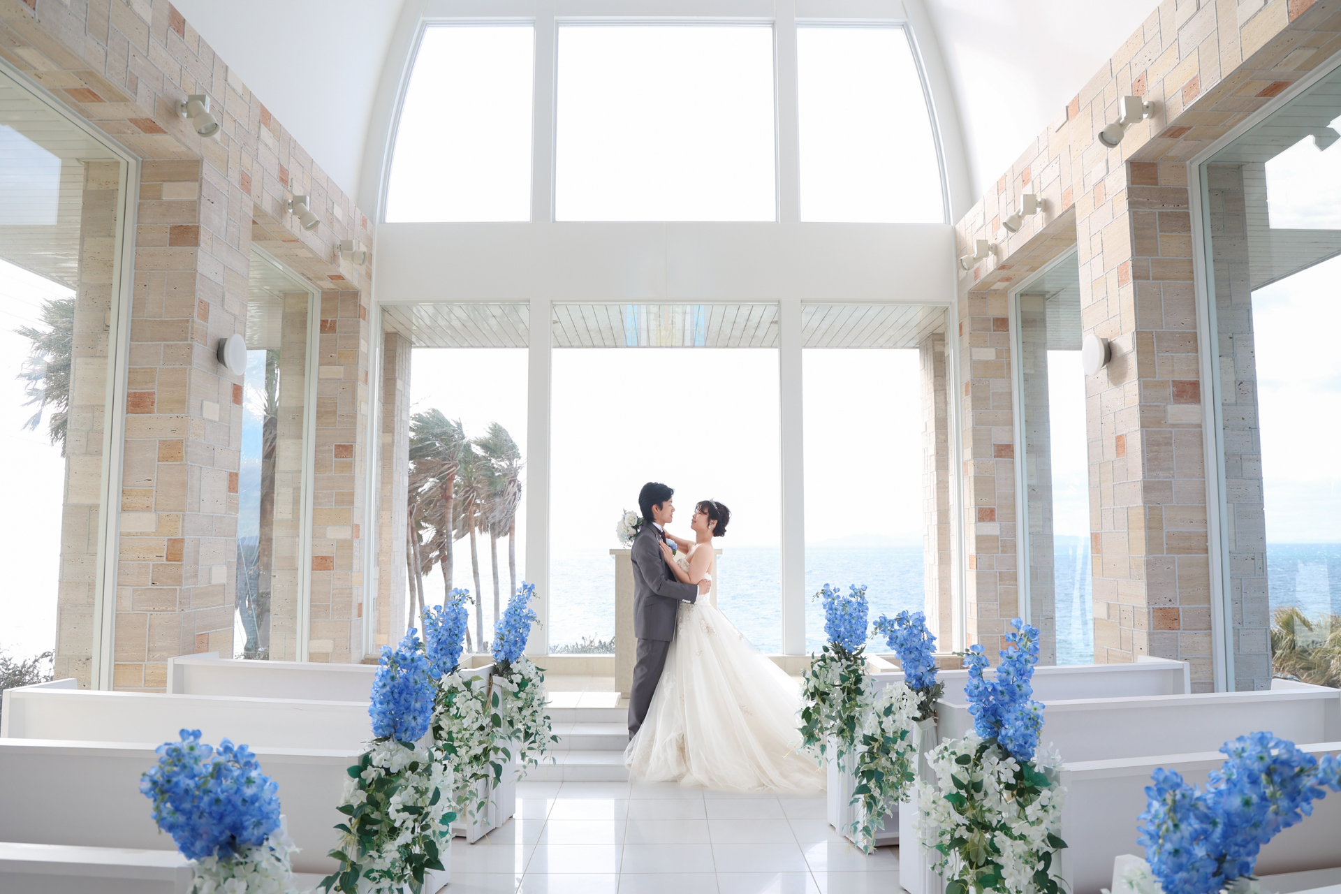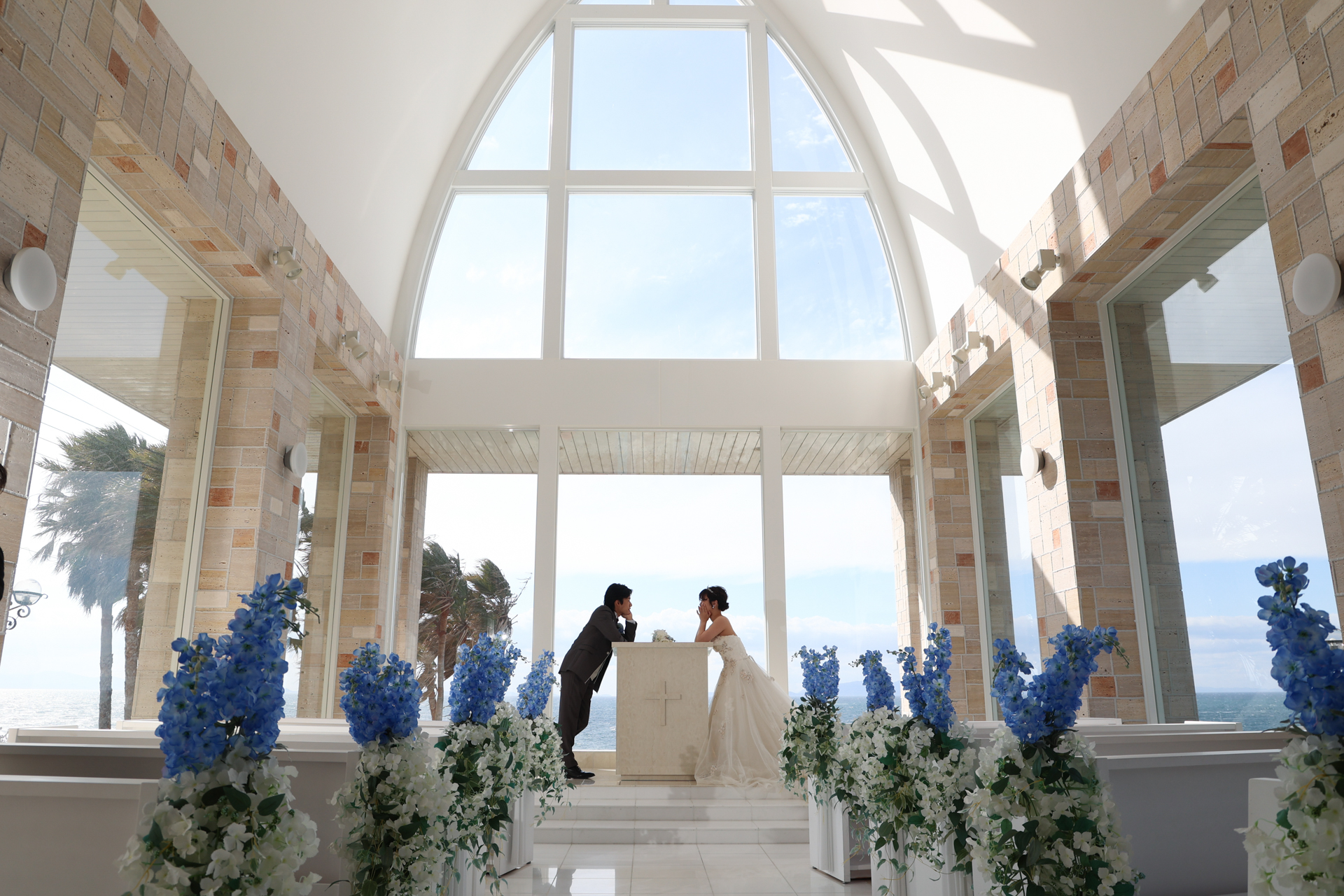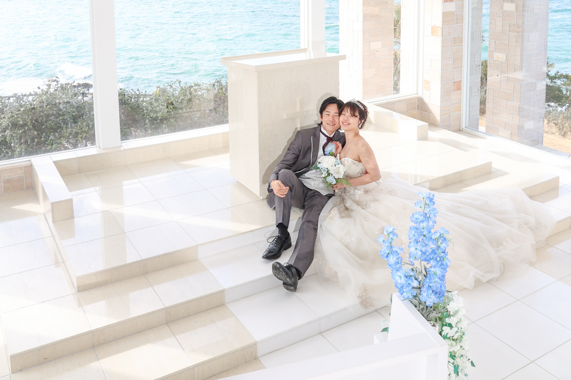 海が見えるチャペルで寄り添うお二人とカリコリゾートチャペルの撮影の様子です