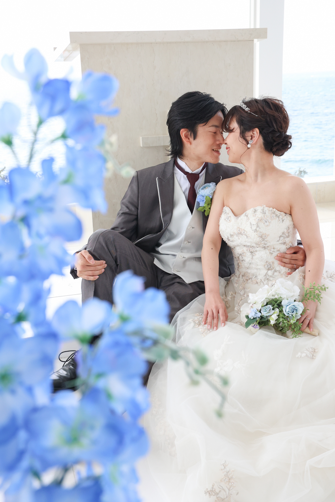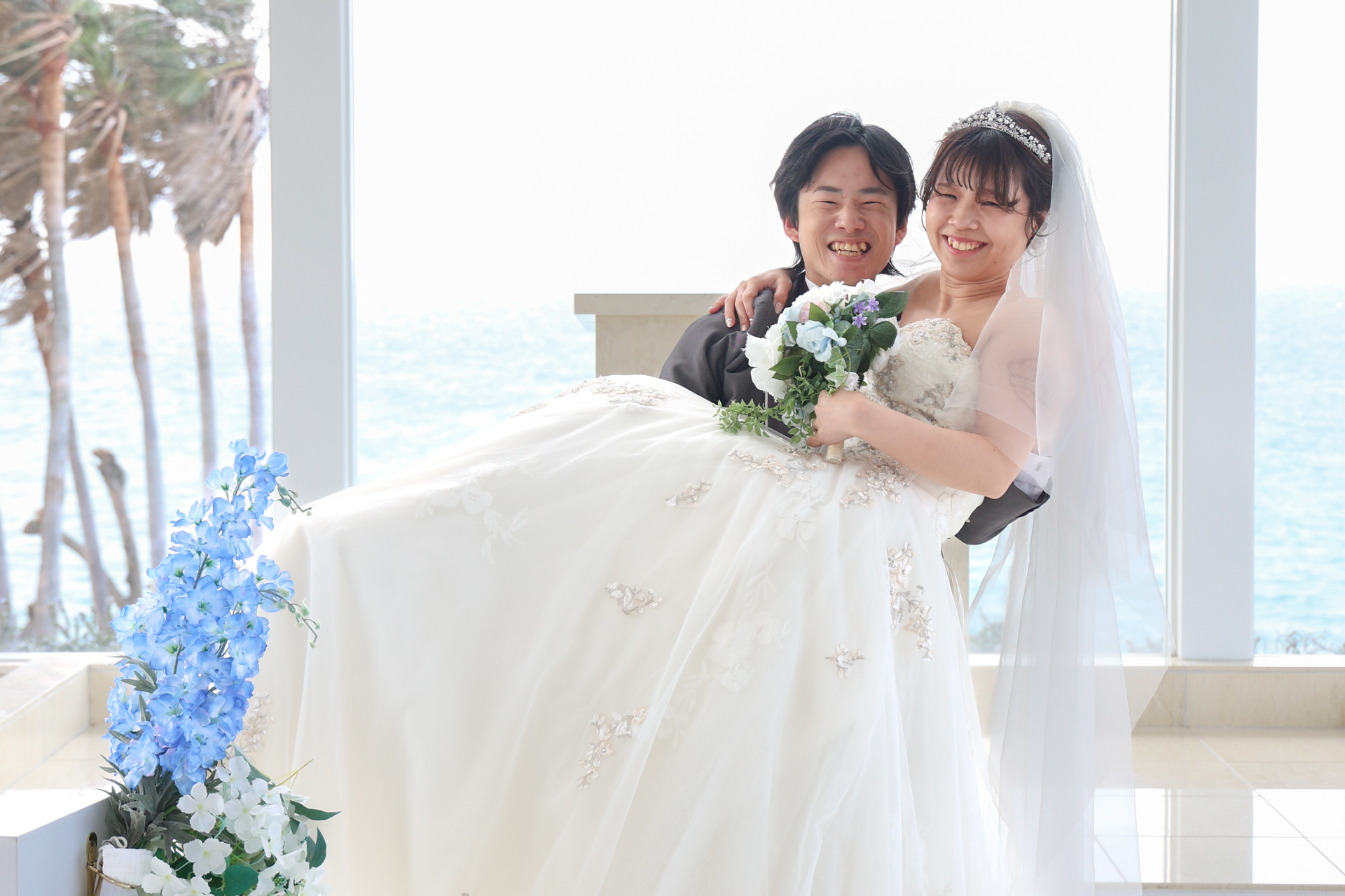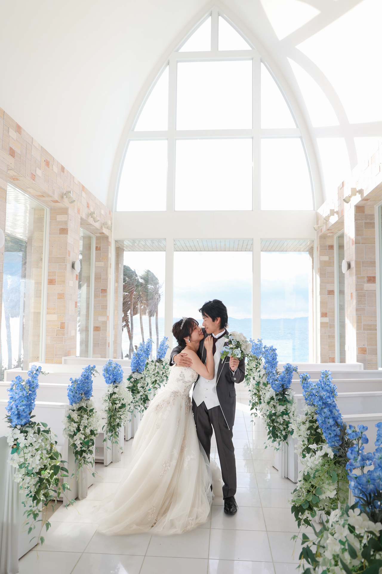 海が見えるチャペルで寄り添うお二人とカリコリゾートチャペルの撮影の様子です