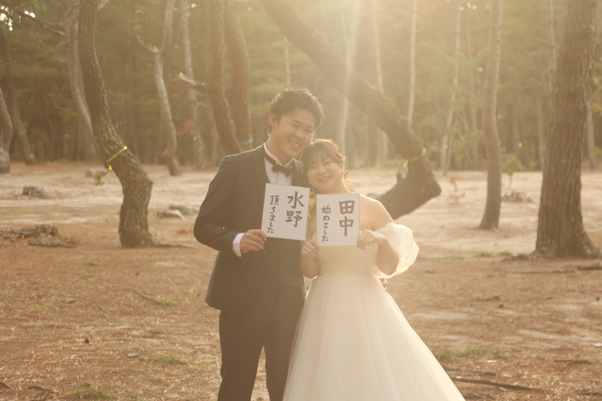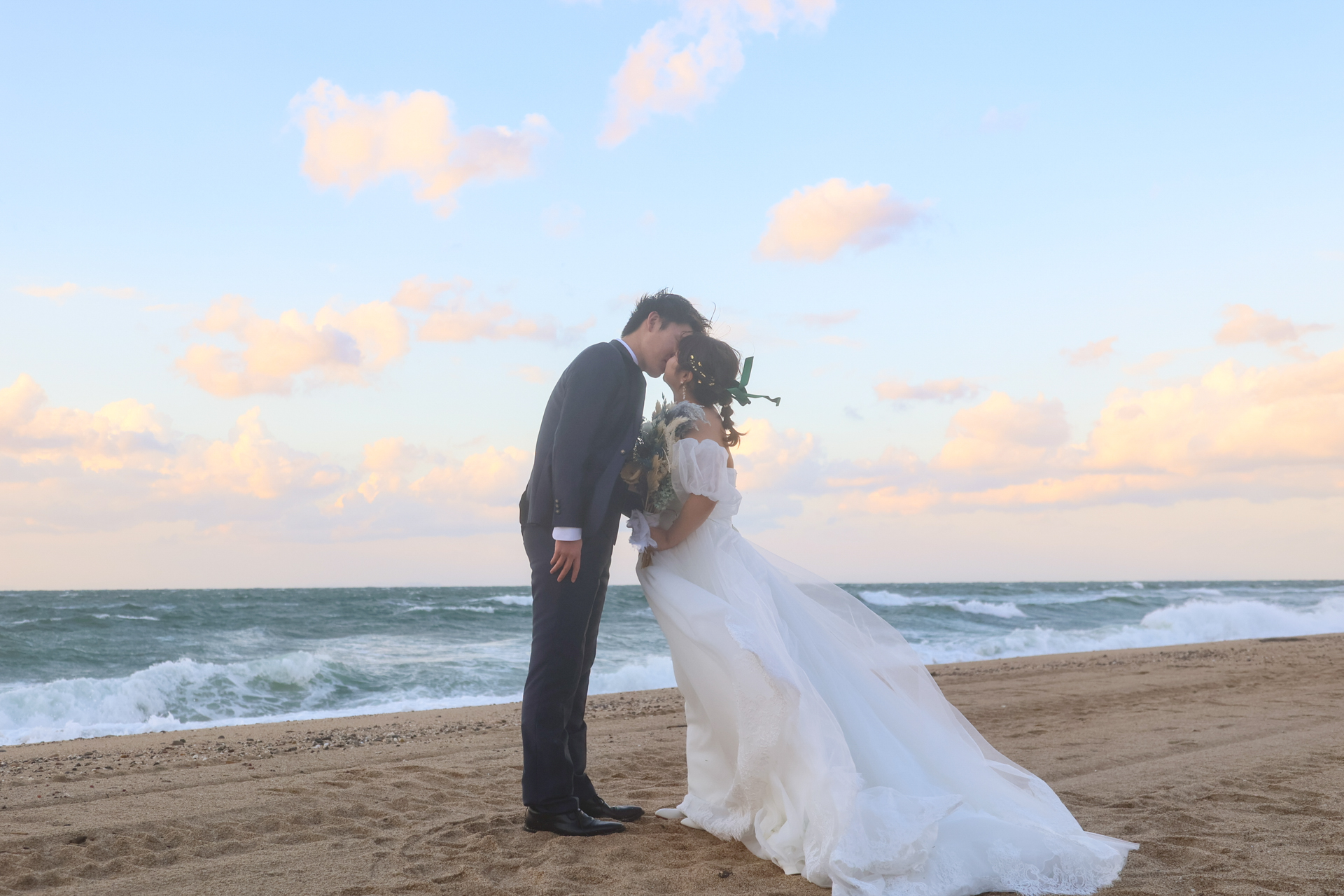 少しずつ日が落ちていく中でビーチ・松林でロマンチックなウエディング撮影の様子です