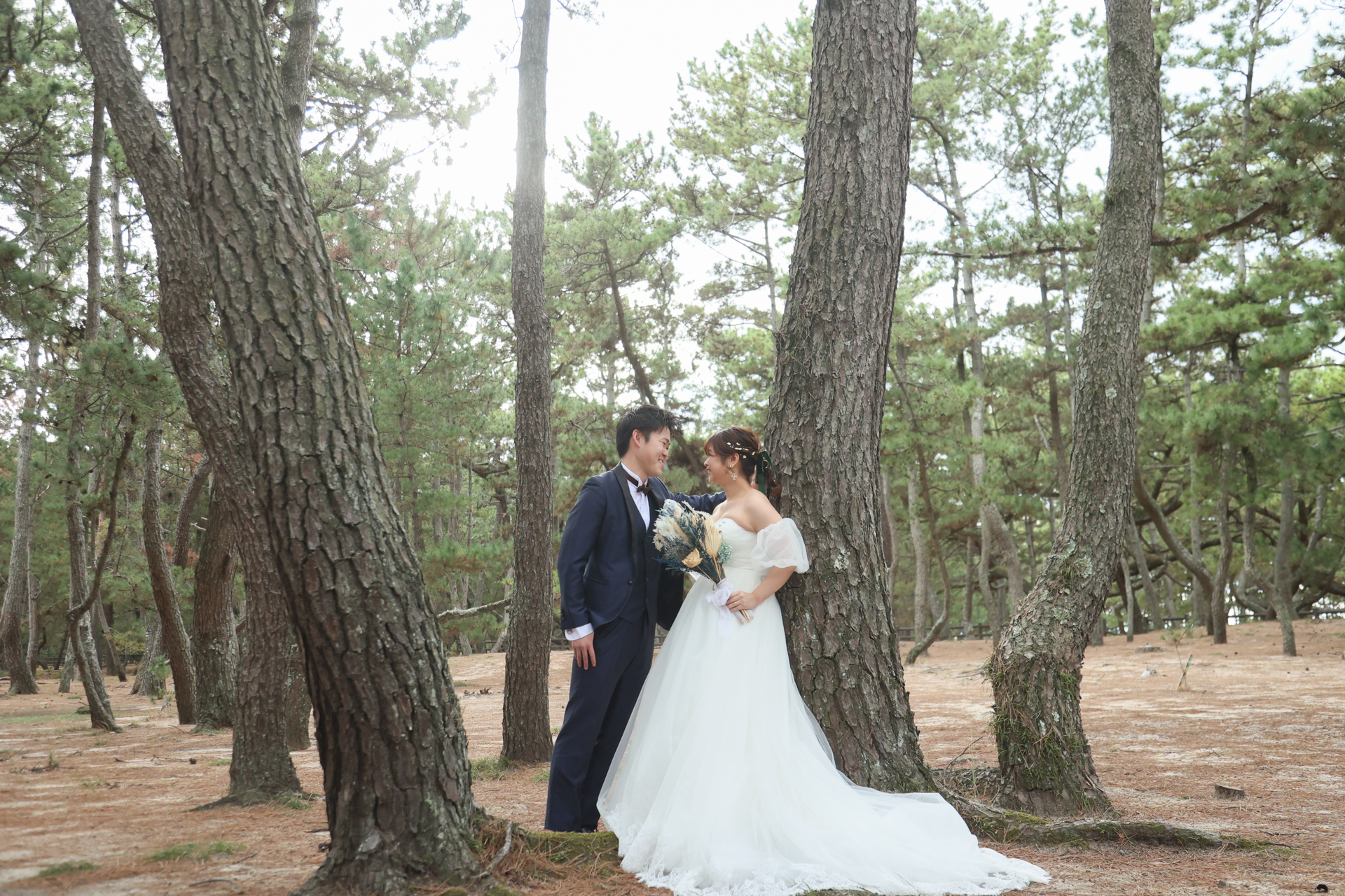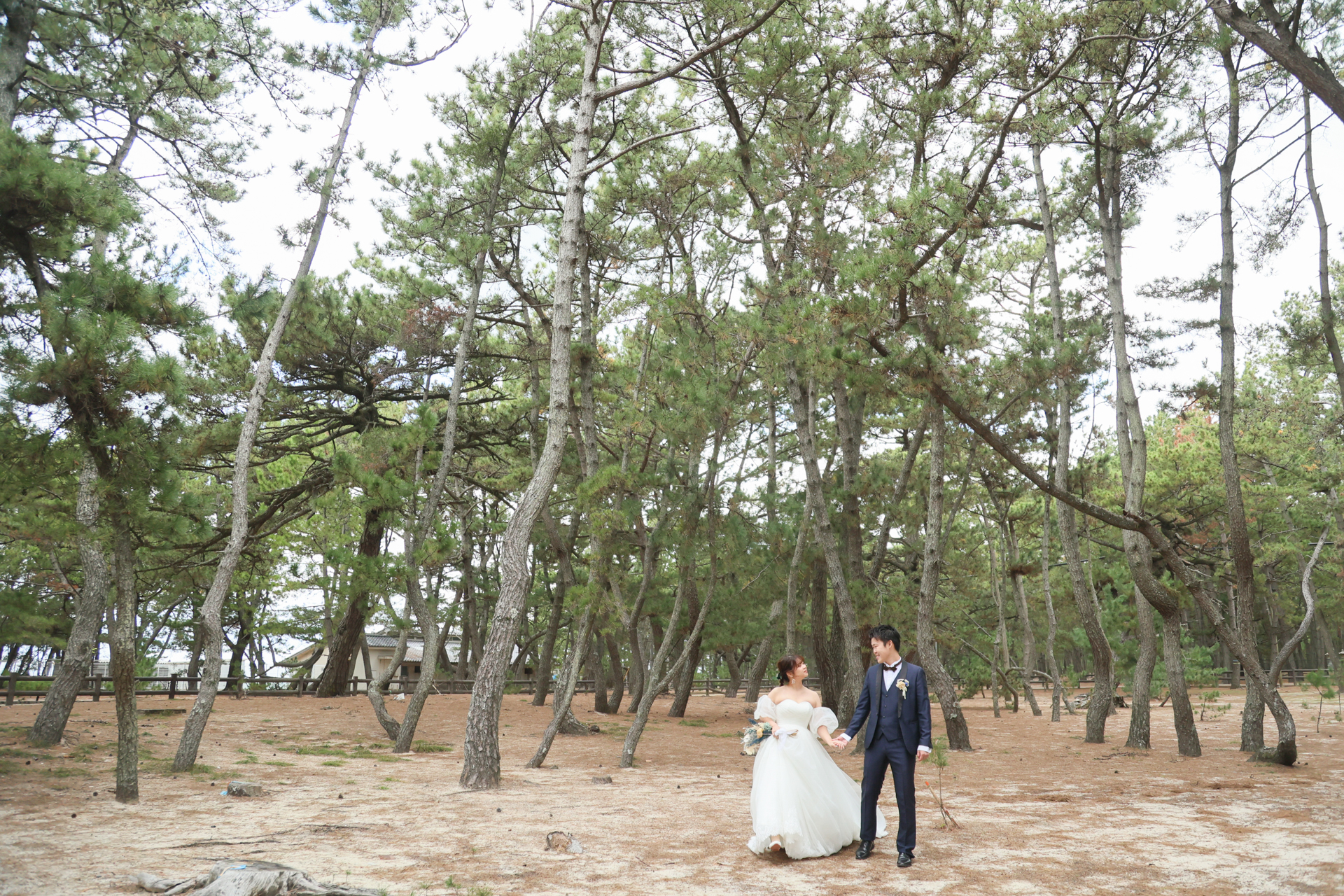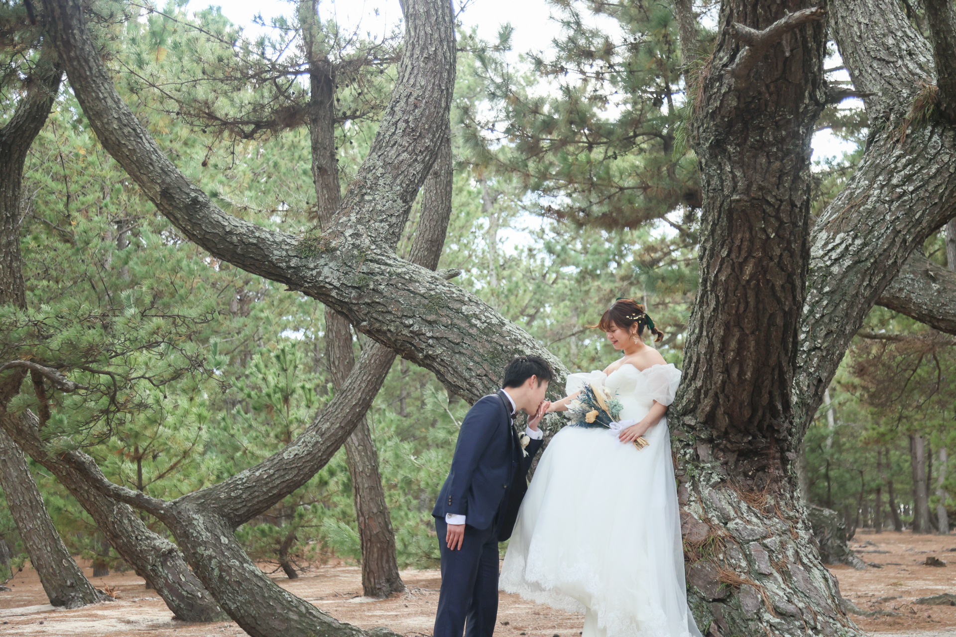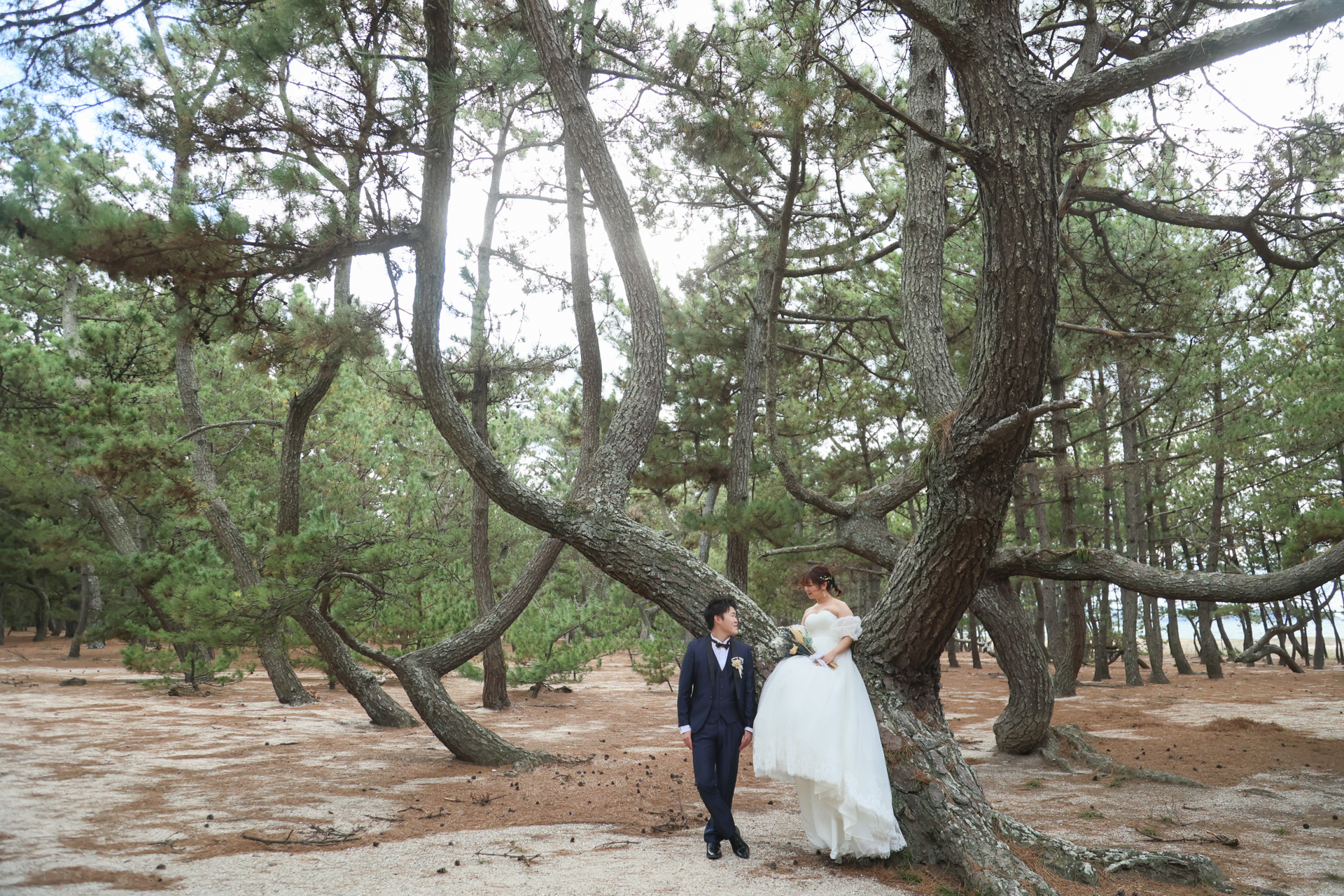 少しずつ日が落ちていく中でビーチ・松林でロマンチックなウエディング撮影の様子です