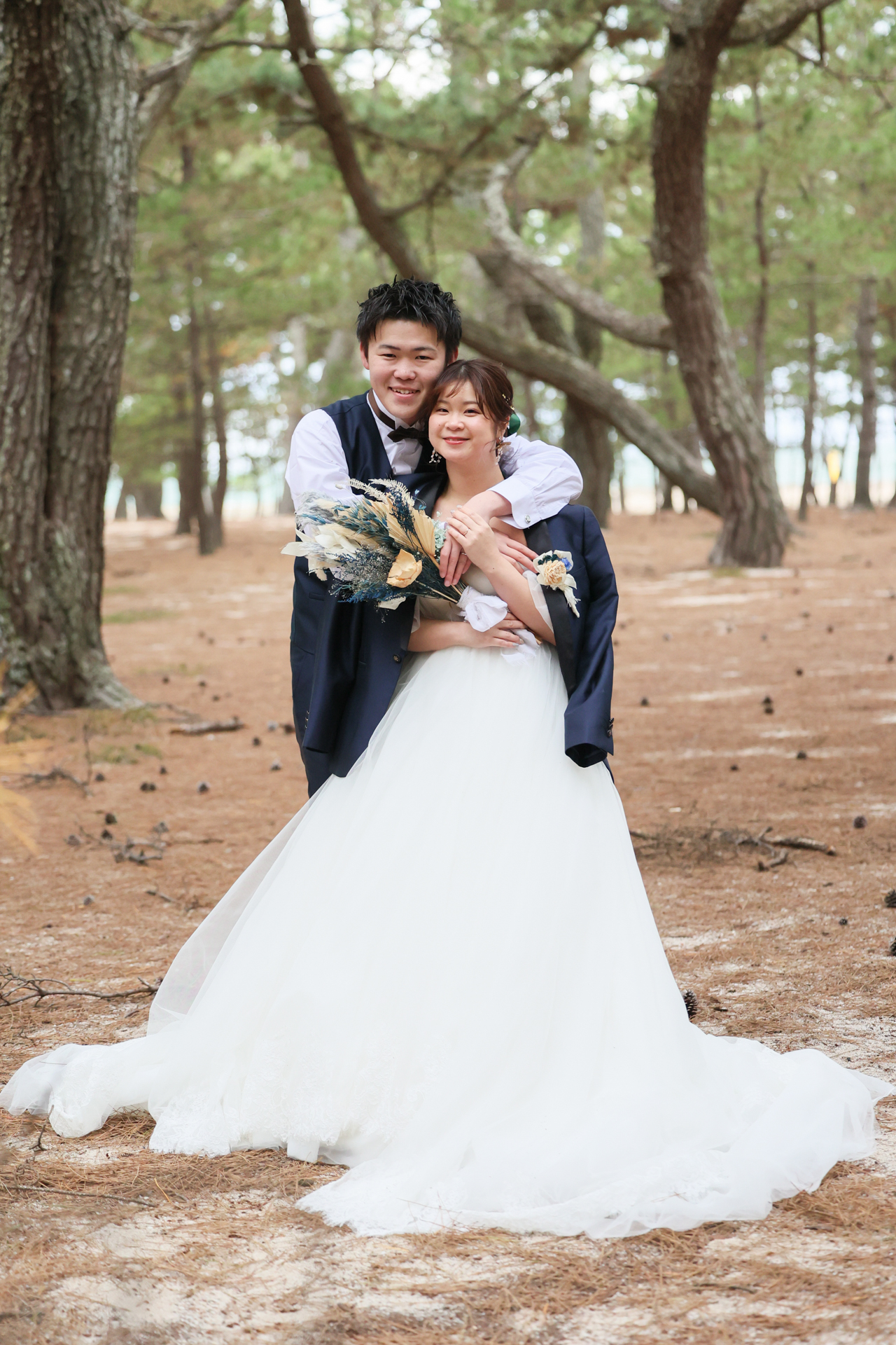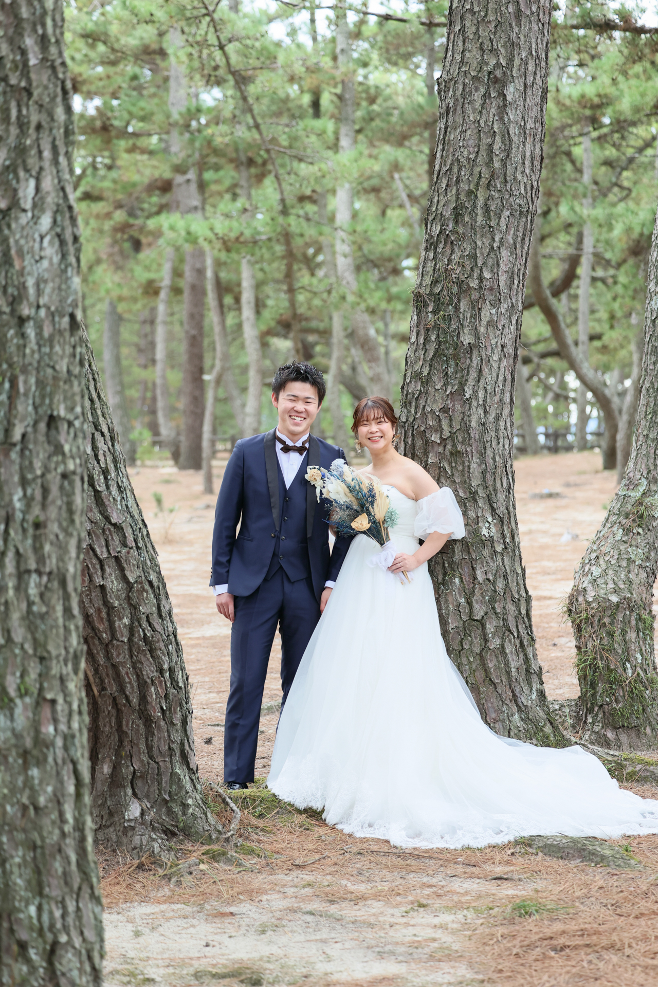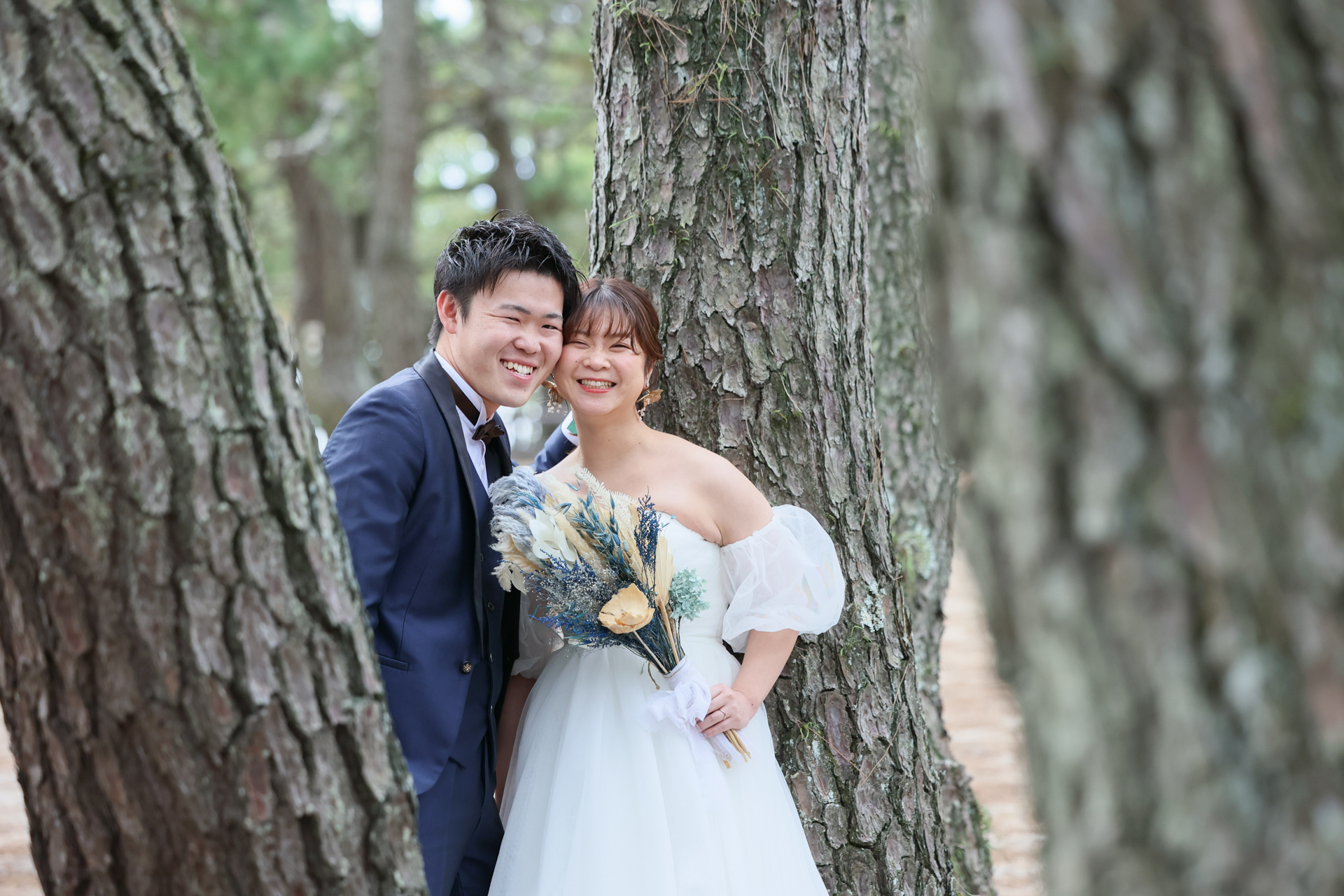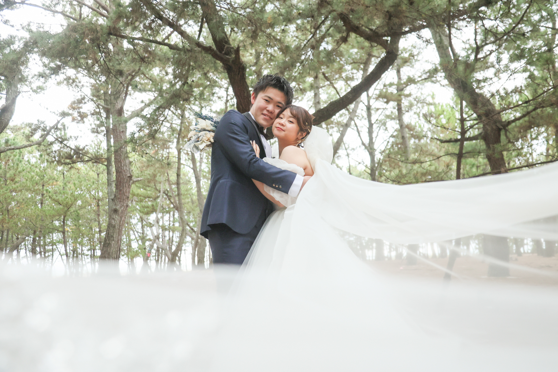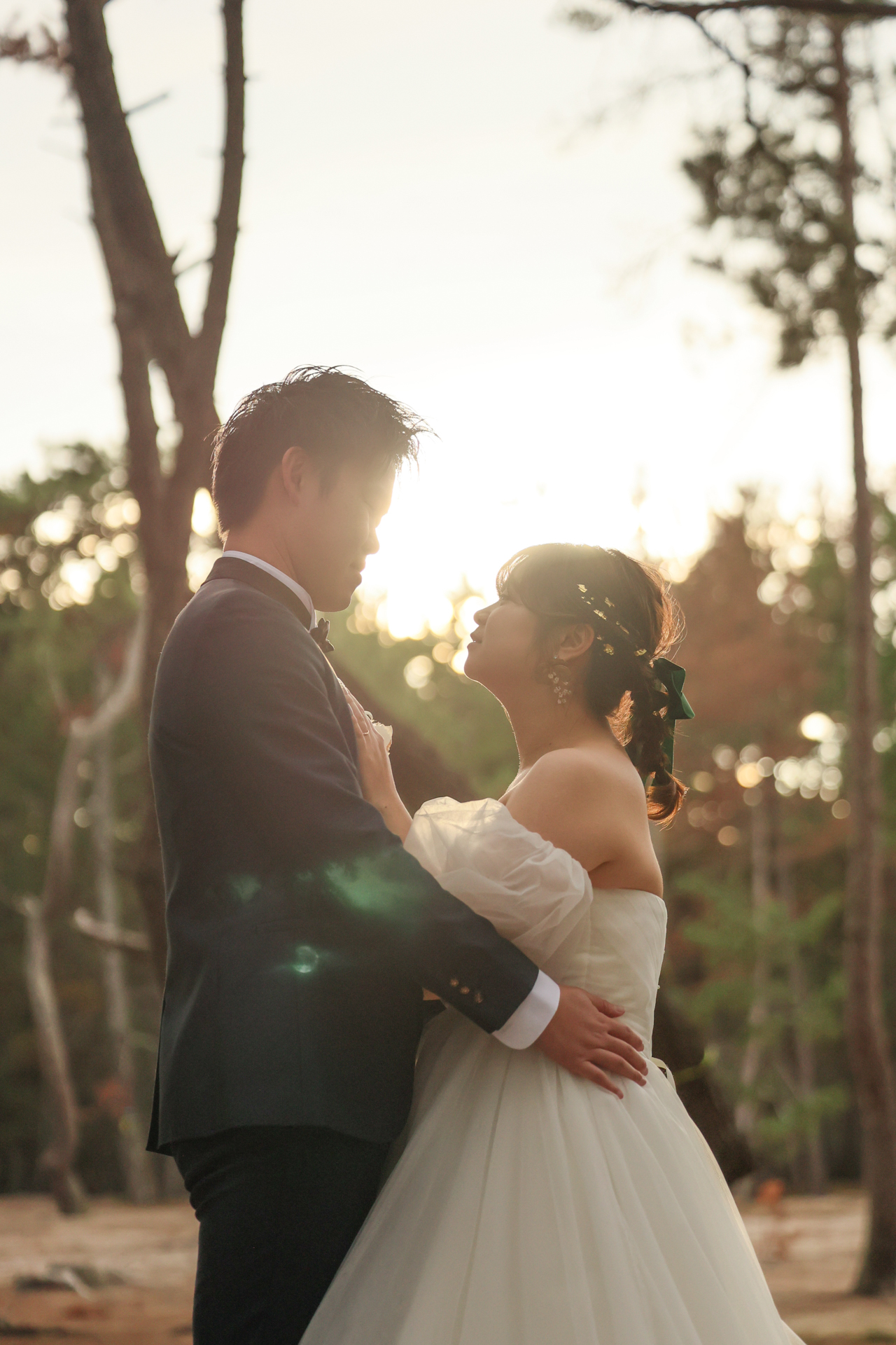 少しずつ日が落ちていく中でビーチ・松林でロマンチックなウエディング撮影の様子です