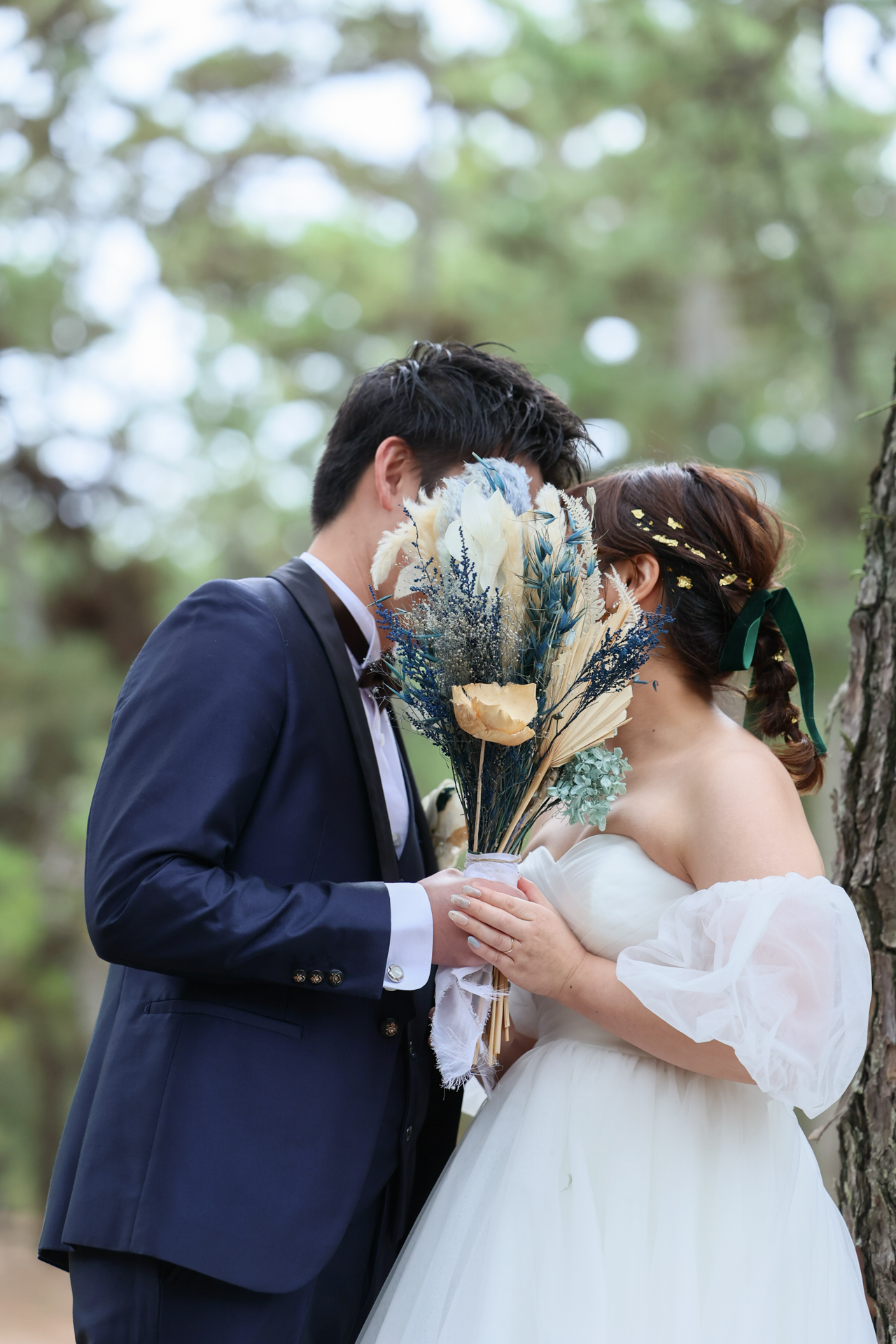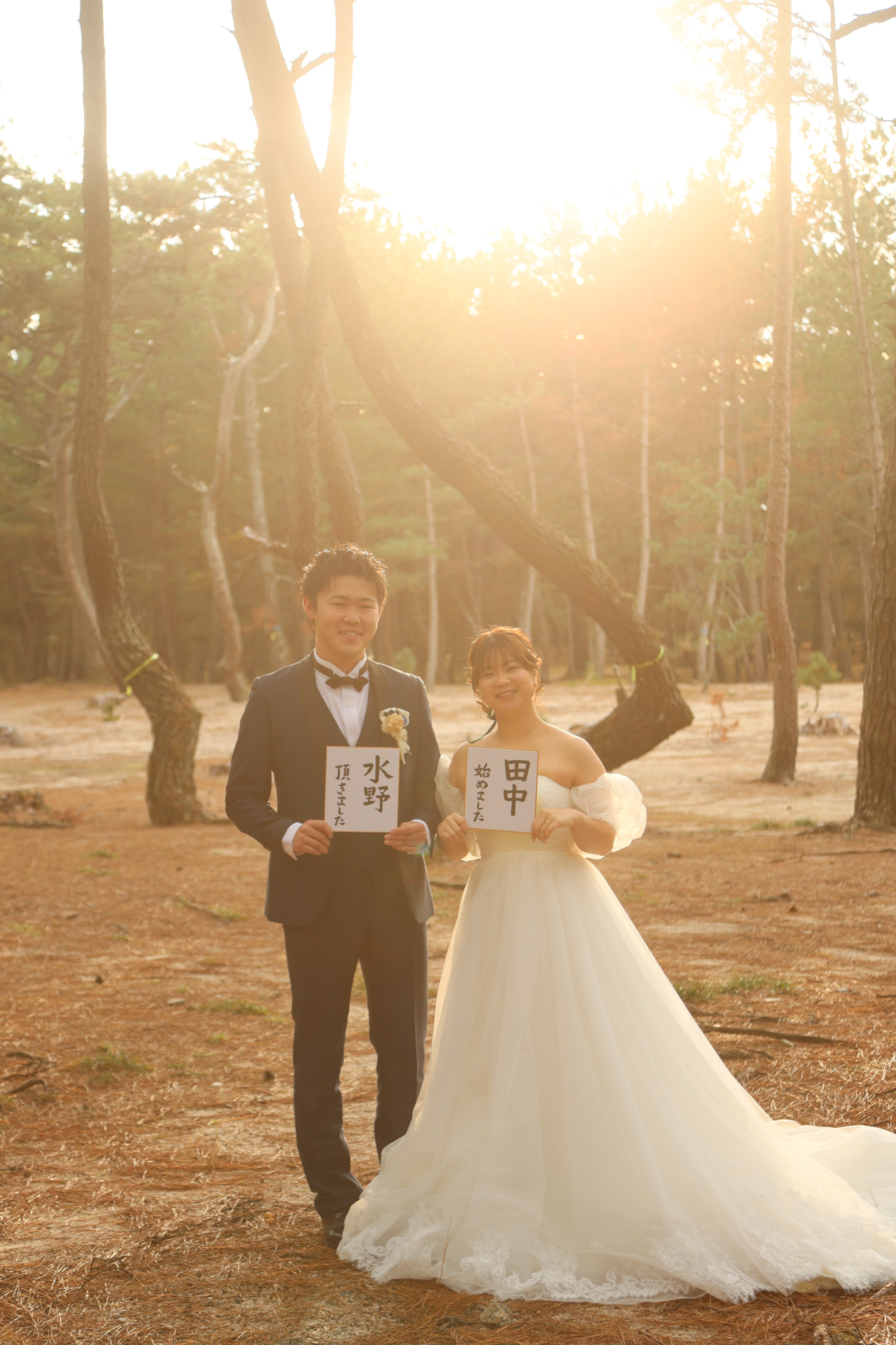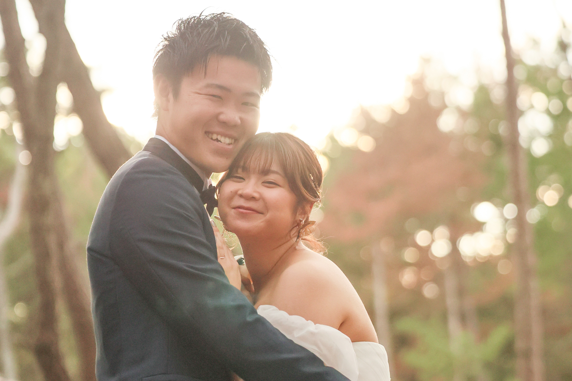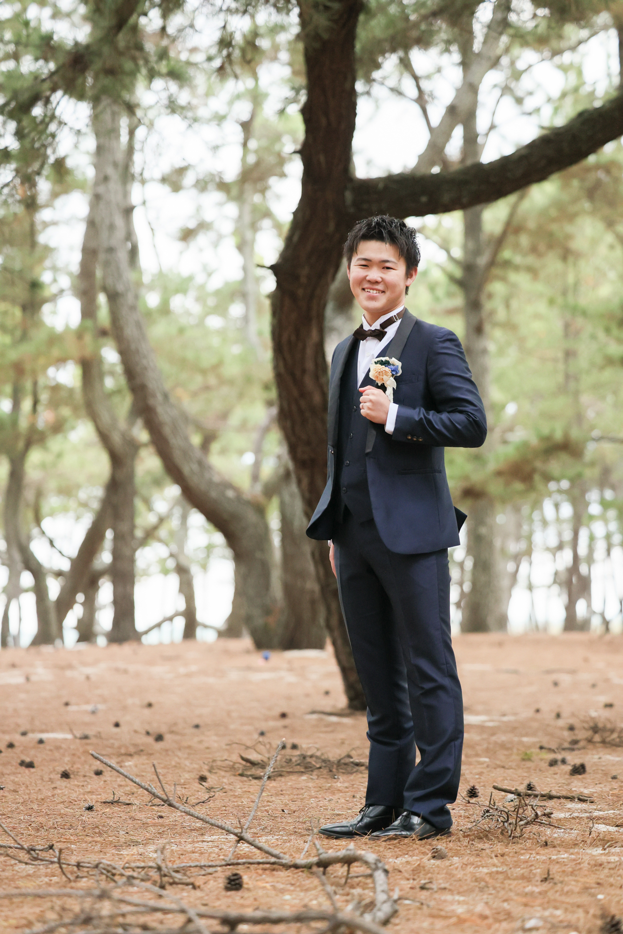 少しずつ日が落ちていく中でビーチ・松林でロマンチックなウエディング撮影の様子です
