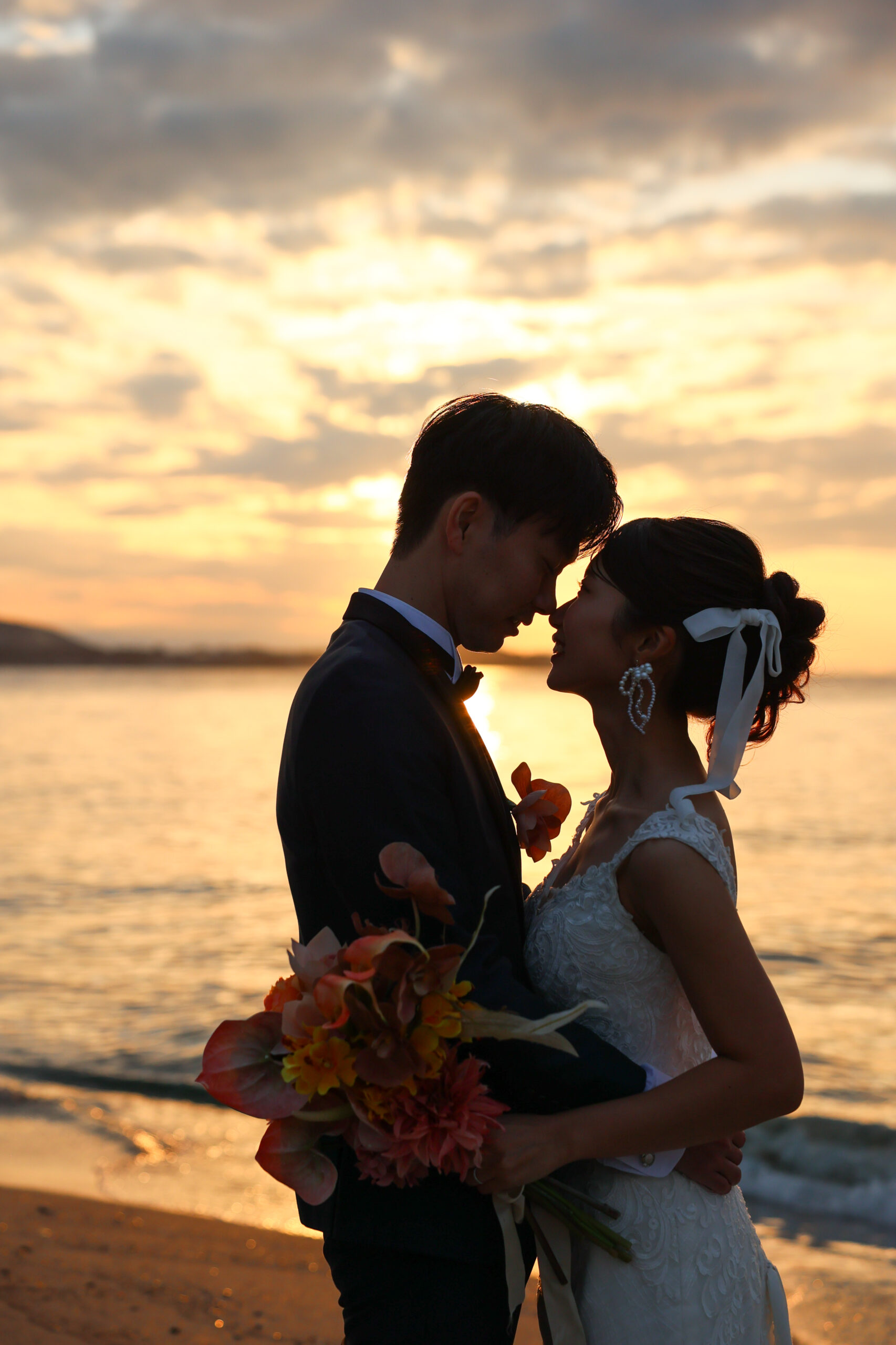 優しく抱きしめる様子がとても愛おしいお二人と秋のビーチでウエディングロケーション撮影です