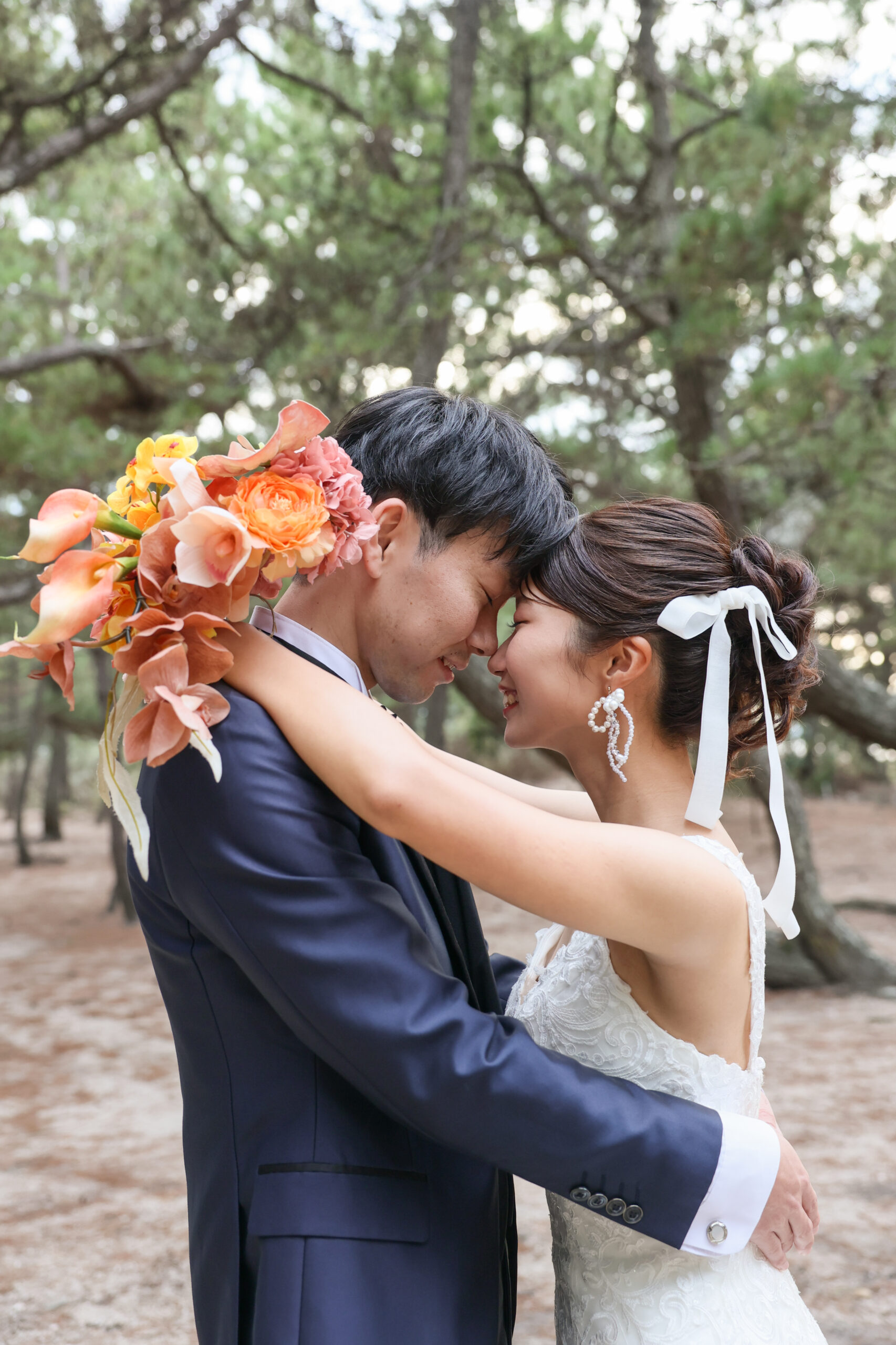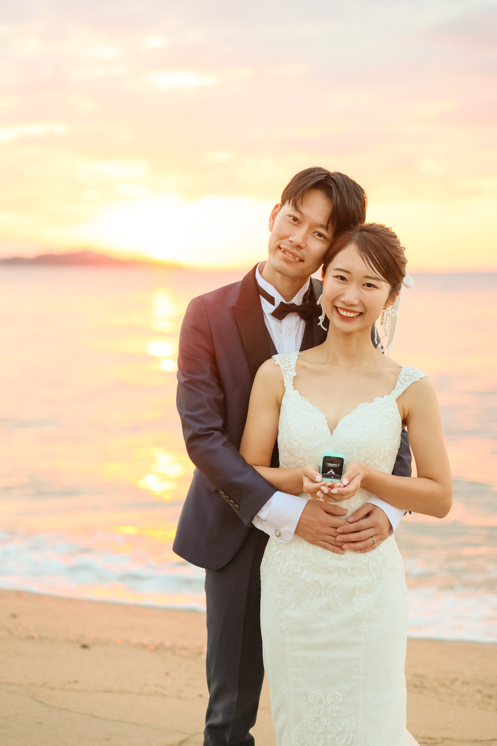 優しく抱きしめる様子がとても愛おしいお二人と秋のビーチでウエディングロケーション撮影です
