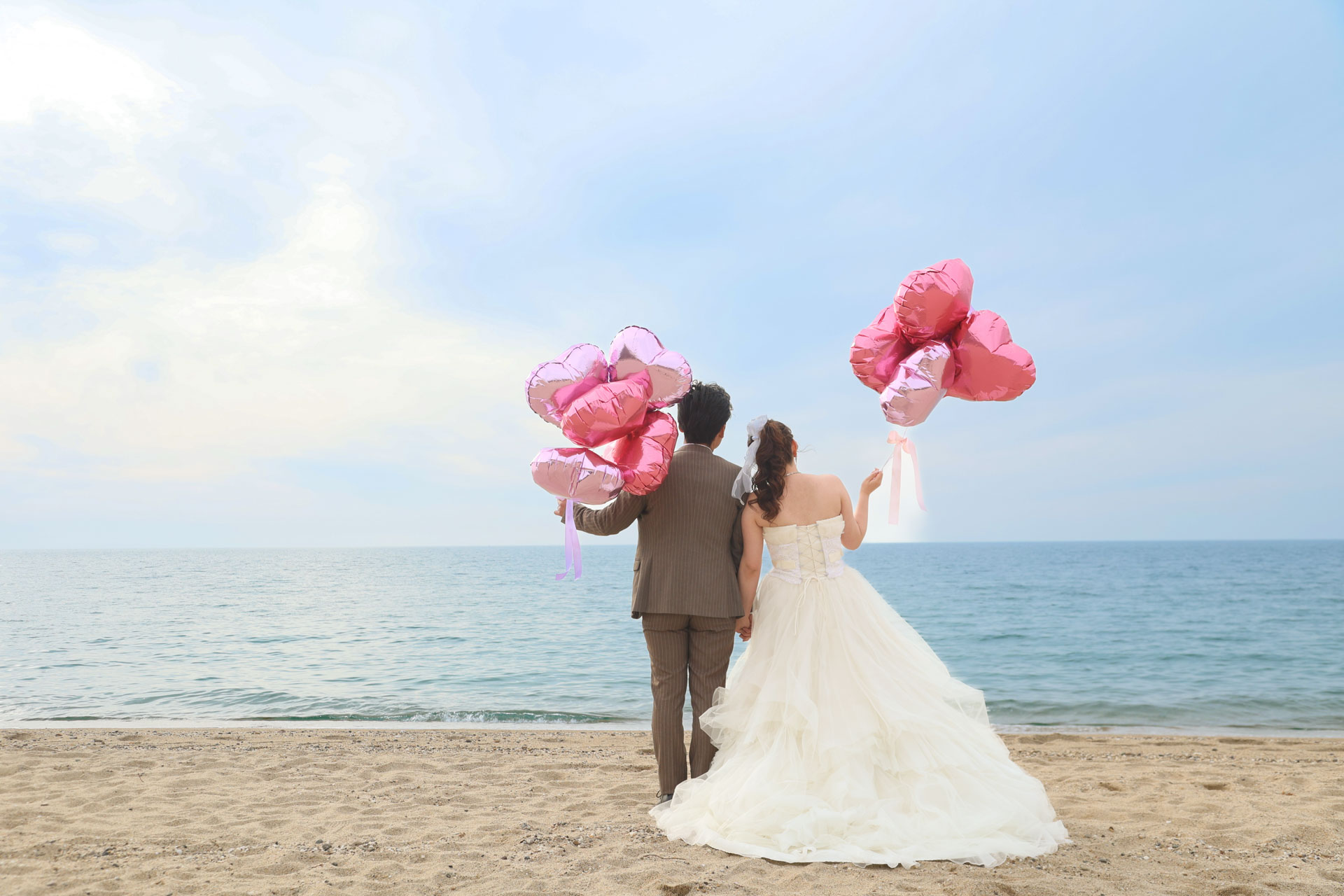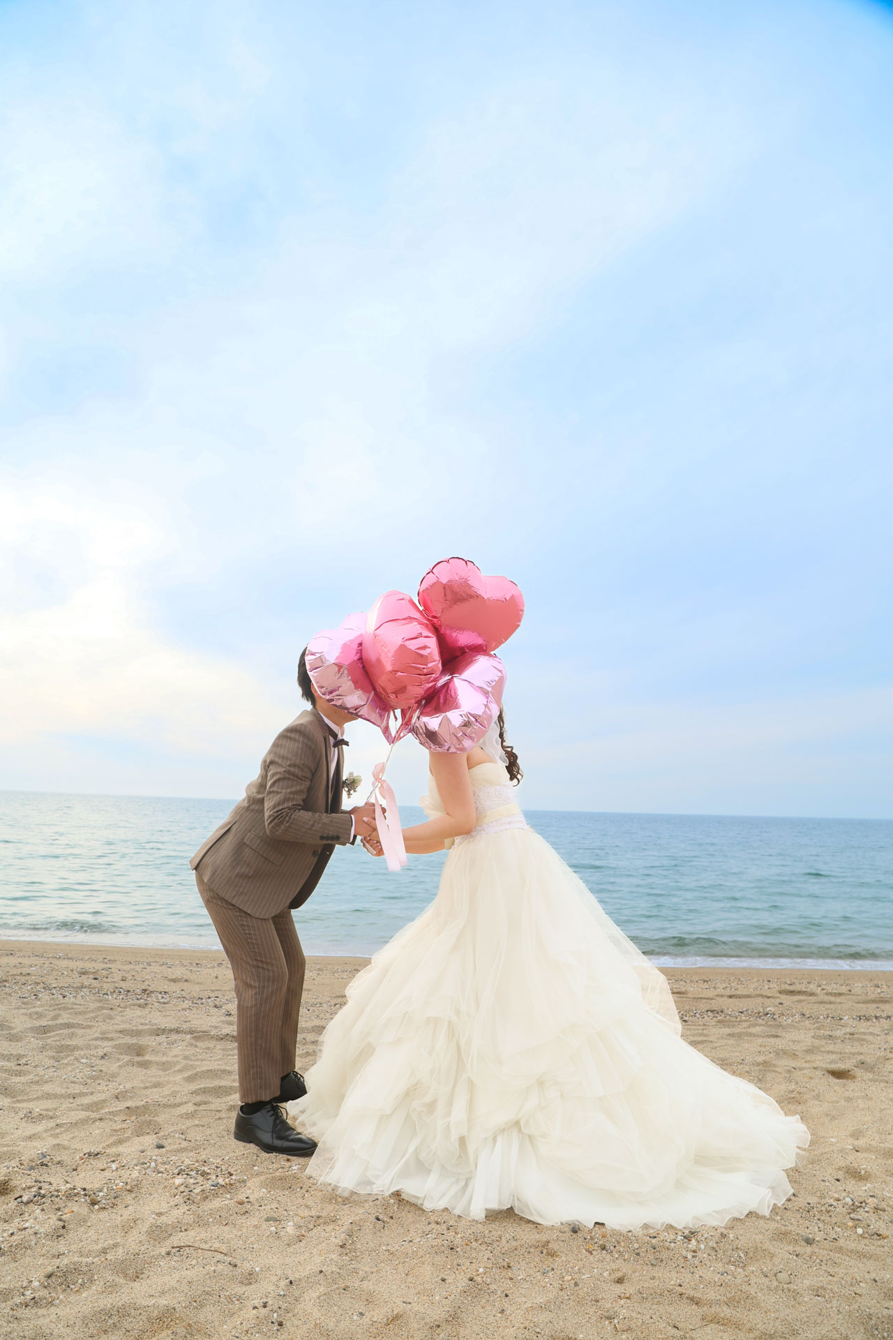 ピンクのバルーンがよく似合う可愛いお二人とビーチサンセットで撮影です