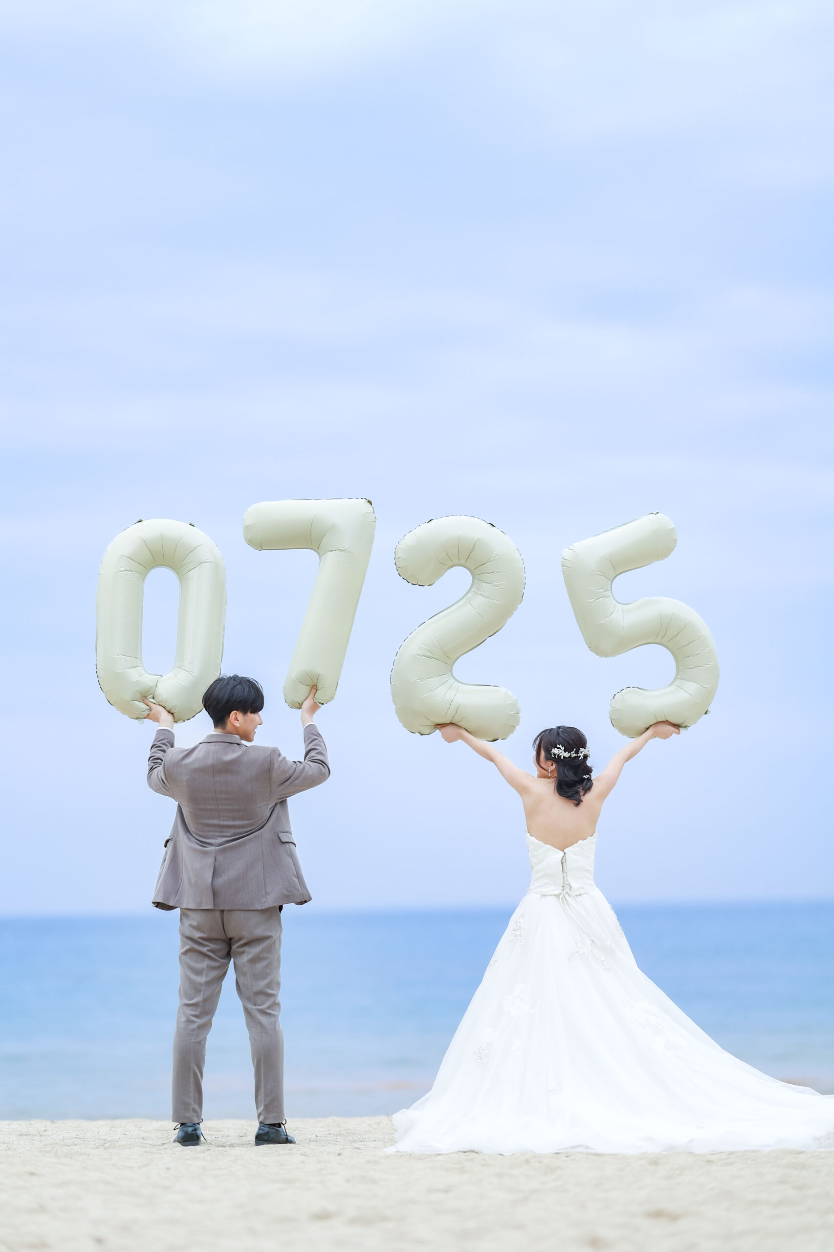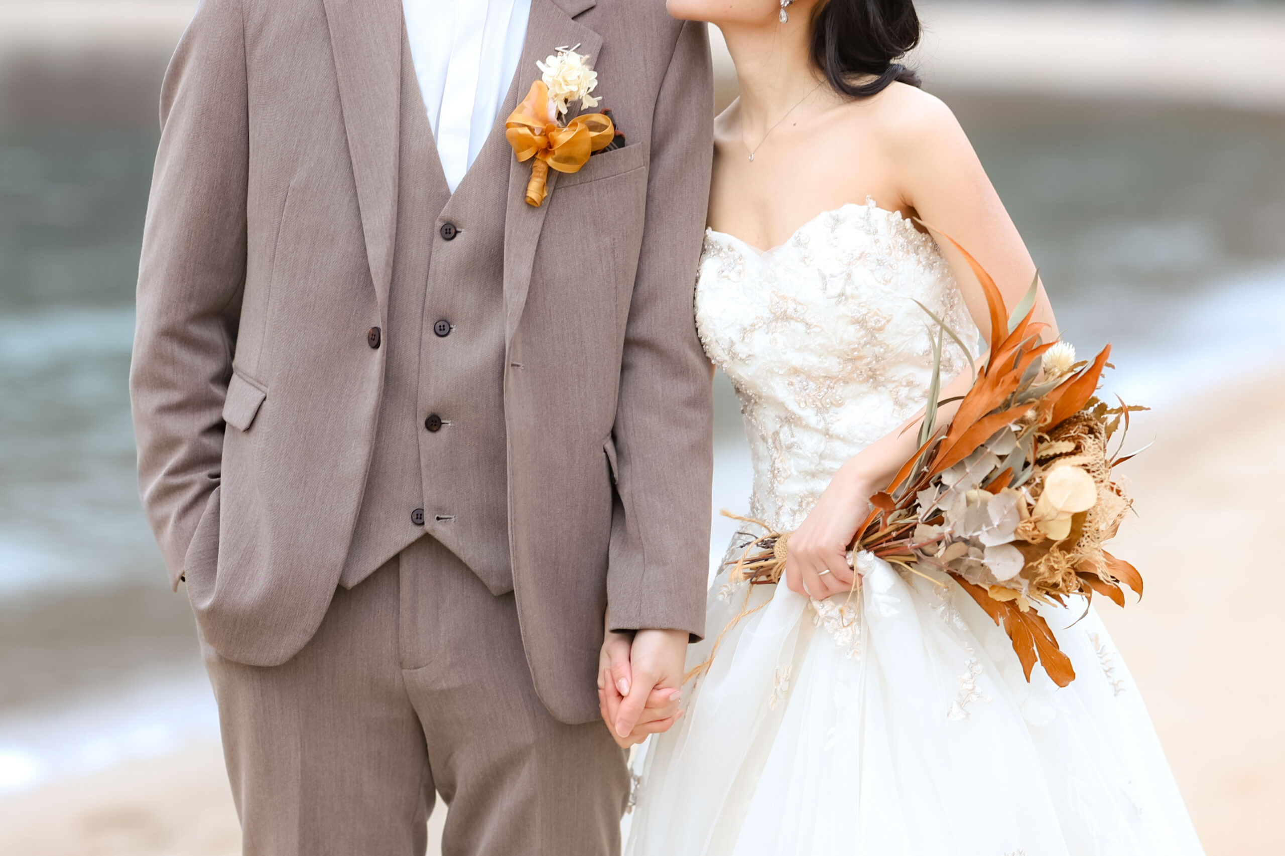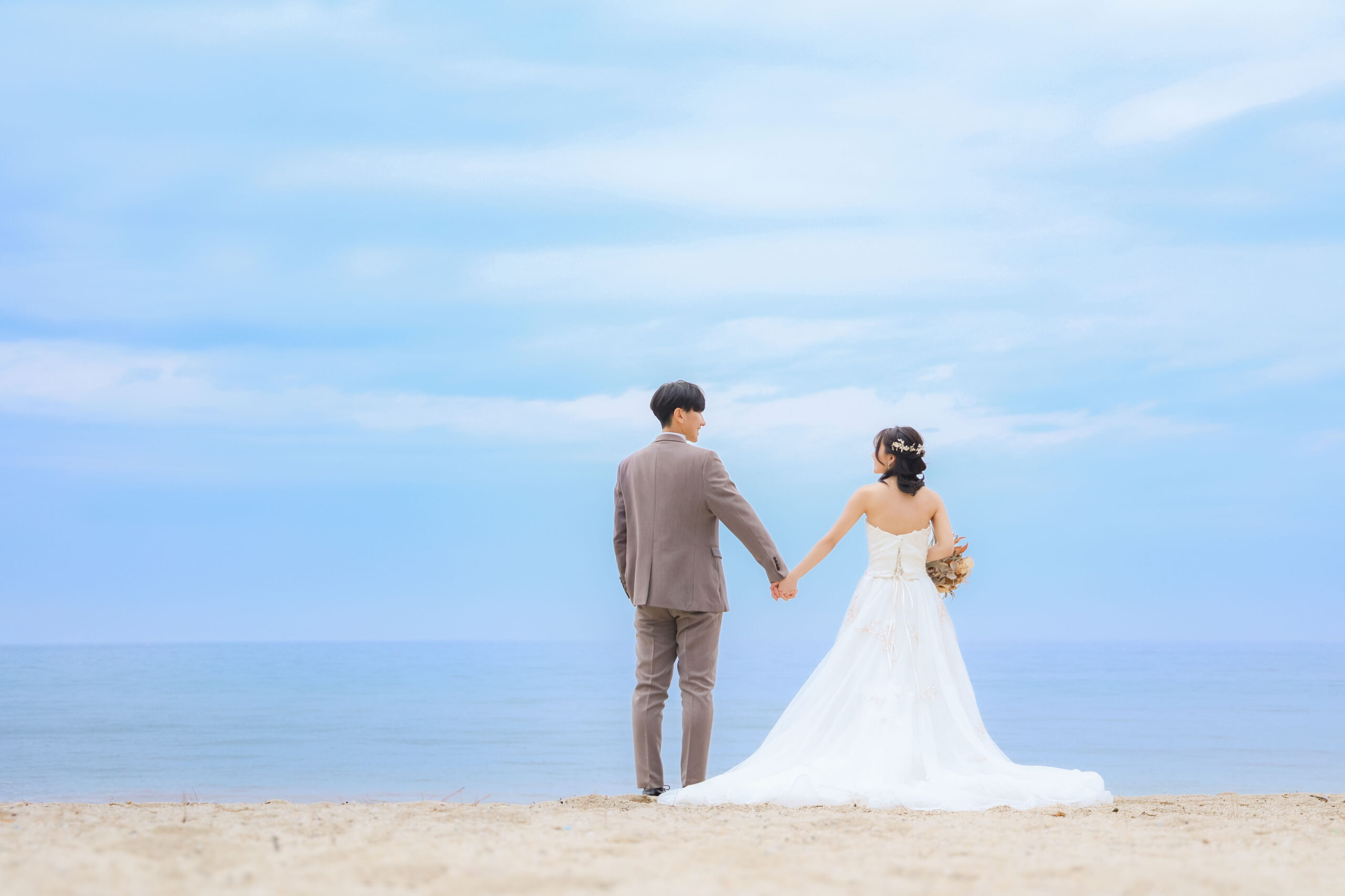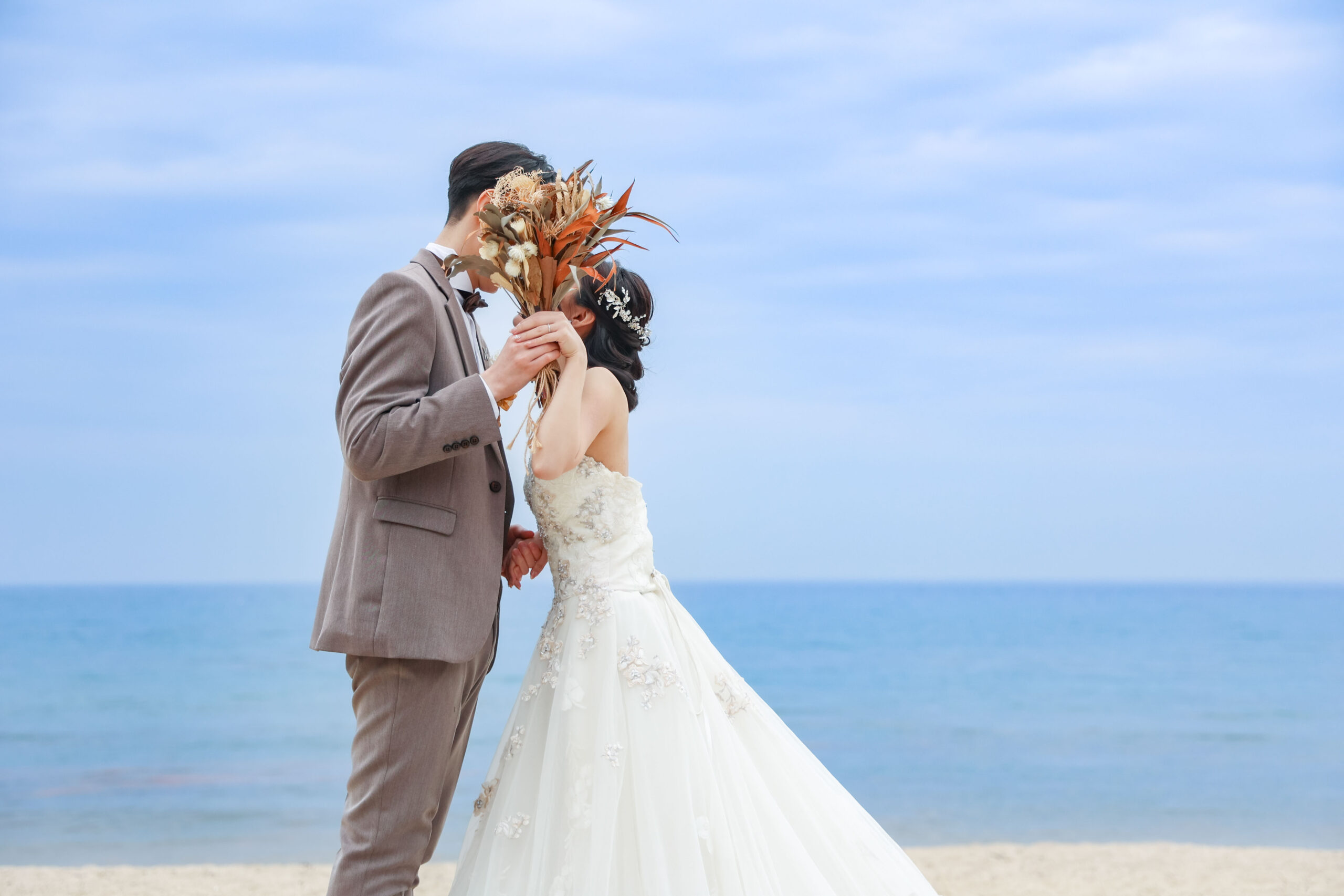 ビーチでは雰囲気がガラッと変わって華やかなウエディングドレスでの撮影です