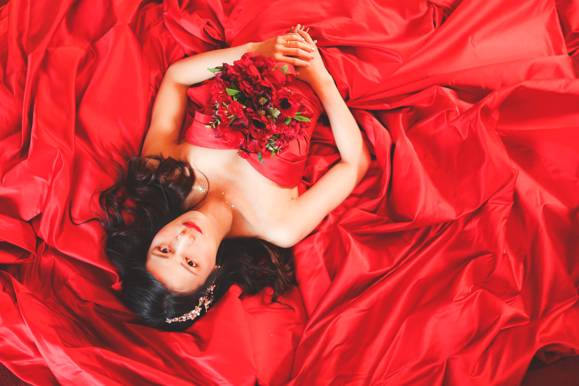 真っ赤に染まった紅葉がとても美しい季節の京都で和装撮影の様子です 赤い絨毯がロマンチッ...